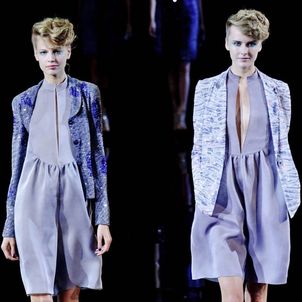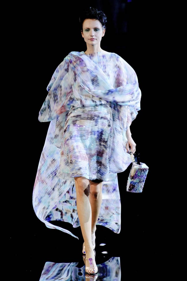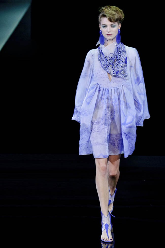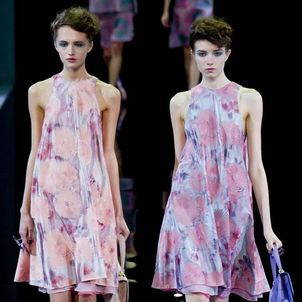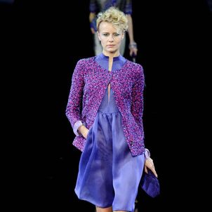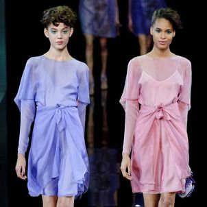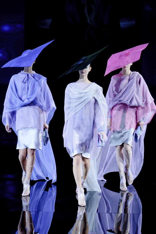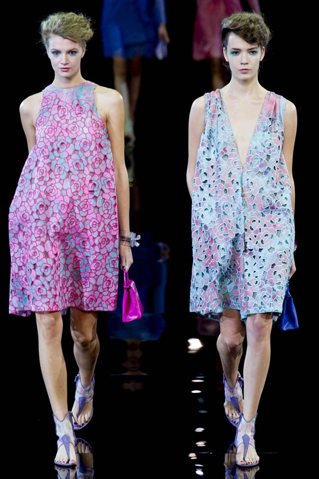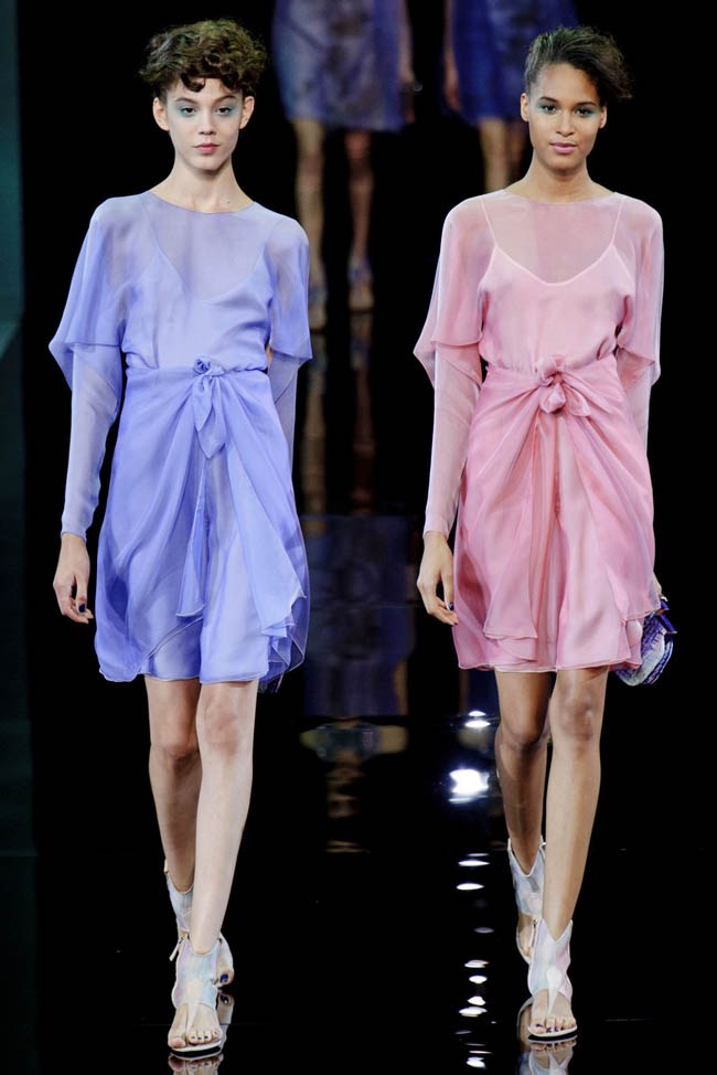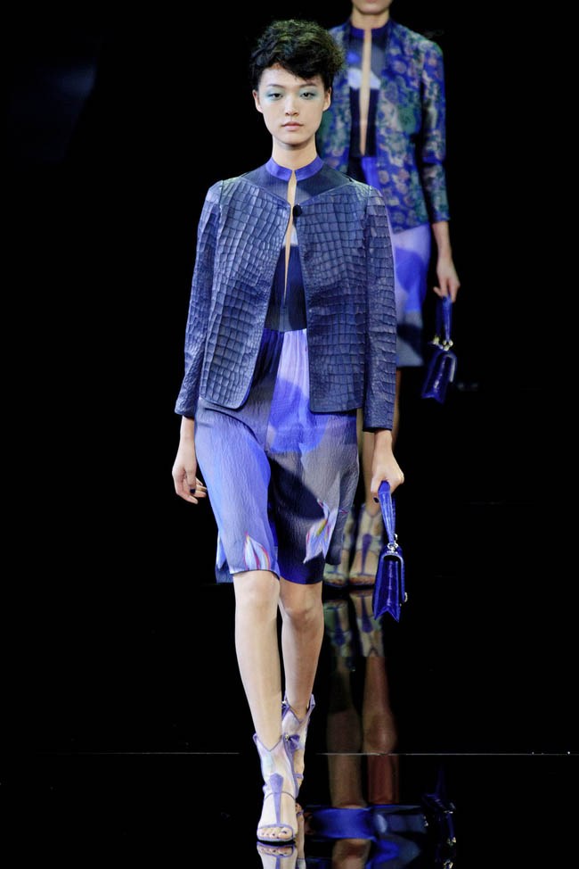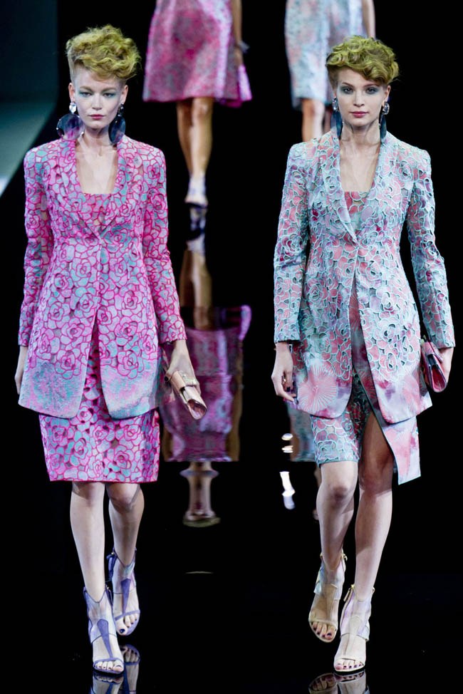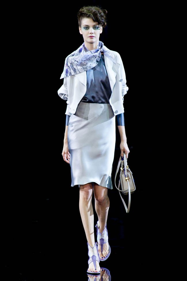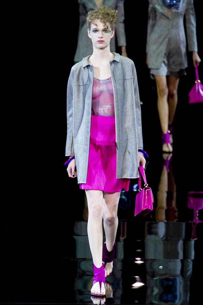 There was also a playfulness too with fuchsia pink and purple dresses, handbags and sandals worn under the grey or high-cut jackets, casually combined with austere pencil skirts.