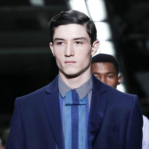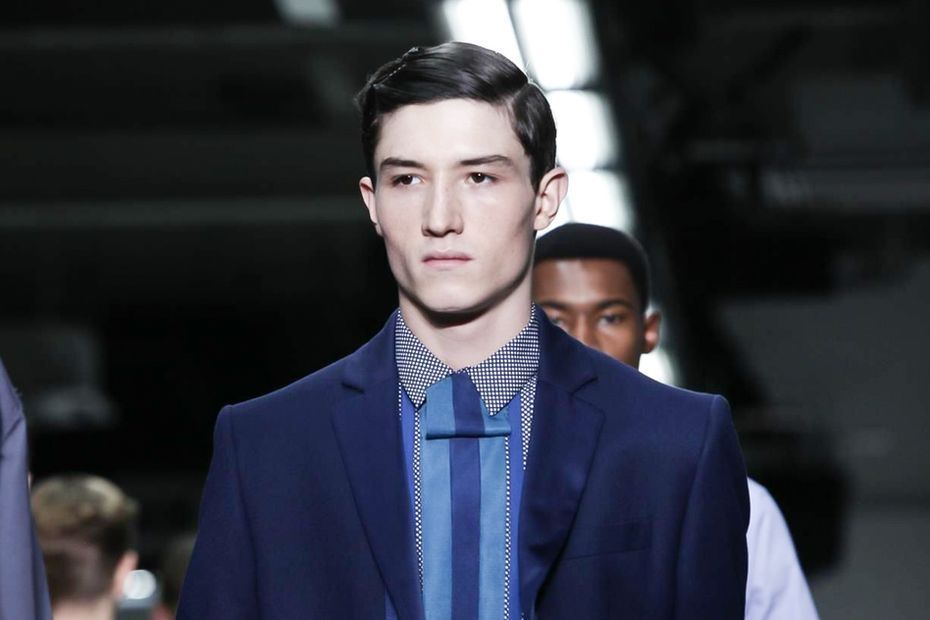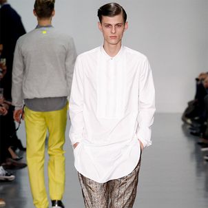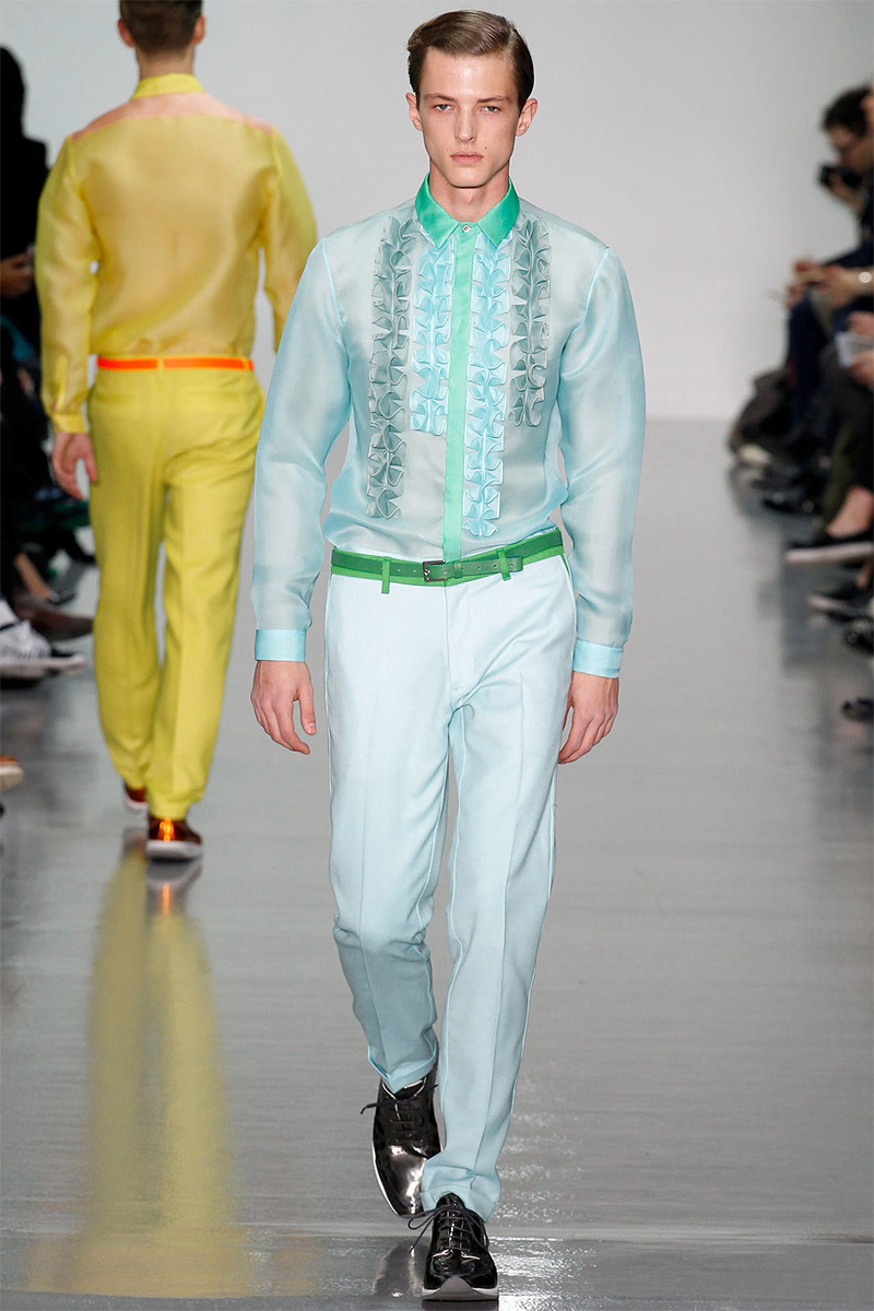 Designer Richard Nicoll unleashed a kaleidoscope of color with his fall/winter 2014 collection. Meticulously thought out, the collection was inspired by the 1975 album Discreet Music by Brian Eno. Balancing discreet and brutal styles, menswear essentials came together in fine form, blending streetwear influences with classic inspirations. Here formal dress shirts became longer counterparts, layered with crewneck sweaters and sporty tops.