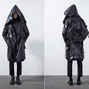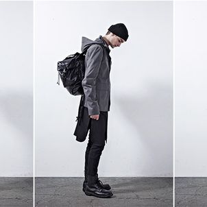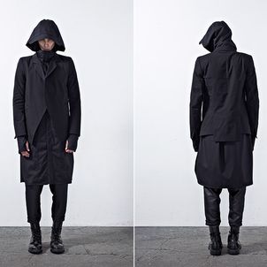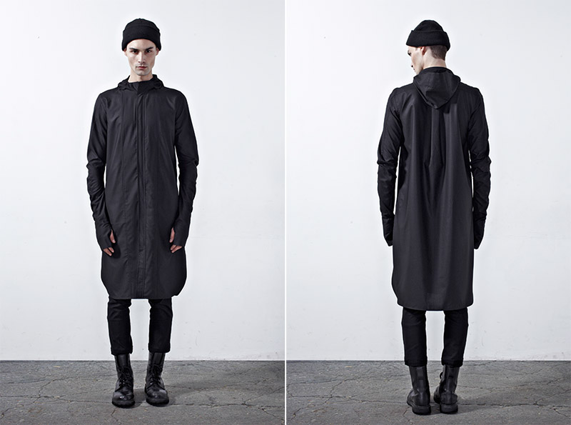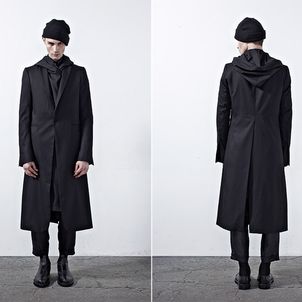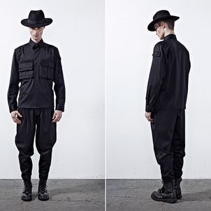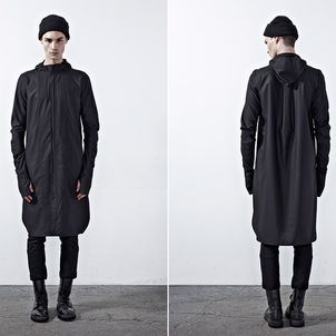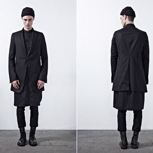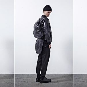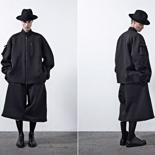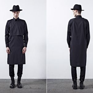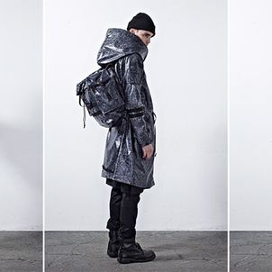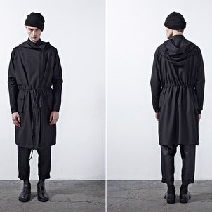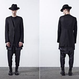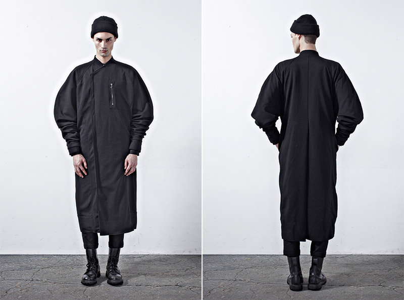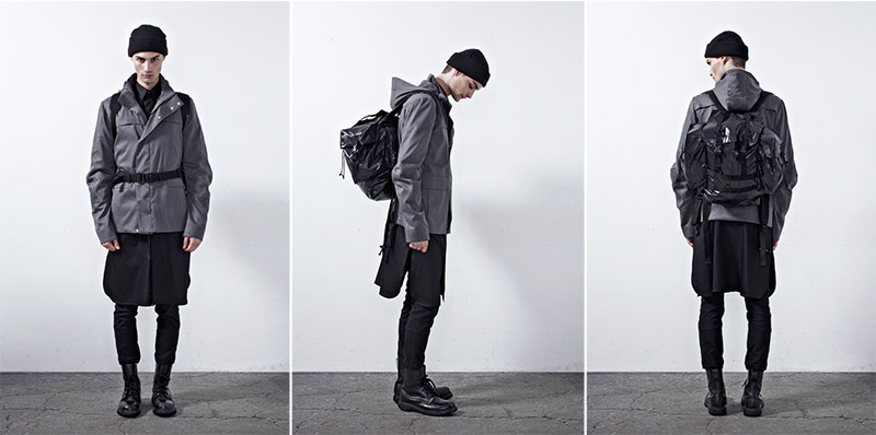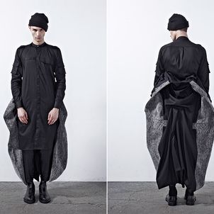Chapter 04’s compositional mood comprises of culture, tradition and the street, expressed through a reduced palette of black, grey and dusty blue. Functional wear was ensued from the transformability of the garments. Emphasis was bestowed on raglan sleeves which sloped around the shoulders, dropped crotch pants added volume and elbow structured sleeves which exaggerated the men’s silhouettes to outré effect.