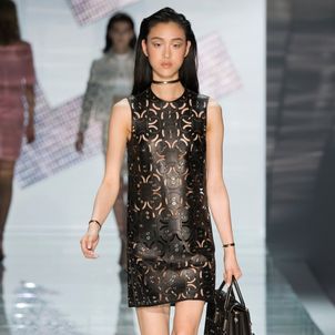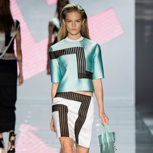 The Italian label, fresh from hitting the headlines with its design for Angelina Jolie's wedding dress, goes all space-age psychedelic with a hint of the 60s in its Spring/Summer 2015 collection seen at Milan Fashion Week. There was a dazzling array of wide T-shirts worn over shirts with miniskirts, a tunic and cropped trousers, a crop top and mid-thigh shorts. Dresses, when they were included, were short, boxy and with sheer panelling.