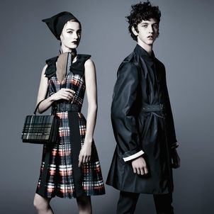 'Captured in Meisel’s New York studios, each photograph features a male/female couple, alternately aloof, or intimately entwined. The neutral gray backdrop focuses our eyes on theirs. The attitudes on display are elegance, poise and dare. The poses also elicit an infinite freedom to interpret the relationships between the characters and towards each of us looking. Gender’s complexities and contradictions have always been an essential, evolving question for Prada. What do men take from women? What do women keep for themselves? The most profound influences from one to the other are often the least apparent, the least visible. These exchanges still charge the cultural sphere. Like the Prada Men’s FW15 show-space, somber blues and blacks pervade the collections, especially a heavy use of black nylon, extending to eveningwear also. Nylon is one of Prada’s iconic fabrics, particularly so when coupled with the allusion to uniforms, another Prada DNA. These hard monochromes are periodically softened by a wool, camel coat or textured, camouflaged checks.' – from PRADA
