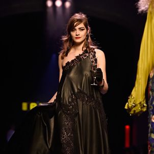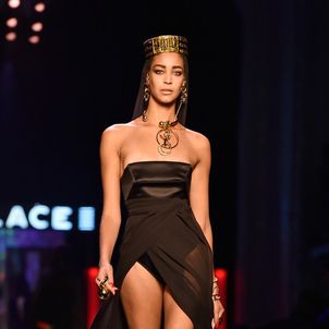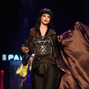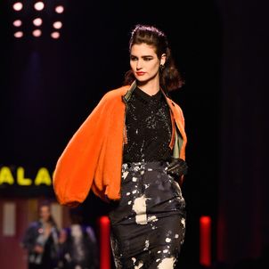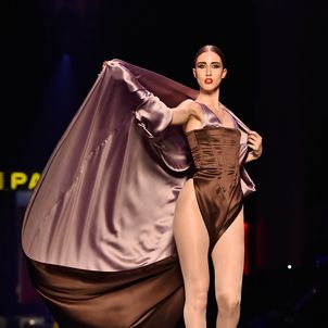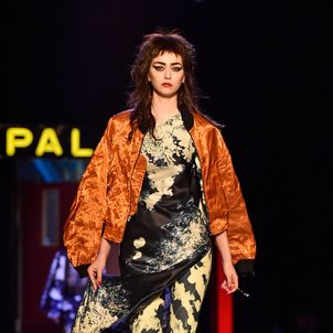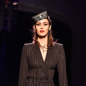 There were slinkier cabaret outfits, too – notably a silk violet cape teamed with a chocolate-hued leotard, and a monochrome cream dress that rippled underneath a black tuxedo jacket that trailed to the floor. The accessories were no less theatrical, with leather gloves, pillbox hats, Egyptian headdresses and eye masks contributing to the debauchery.