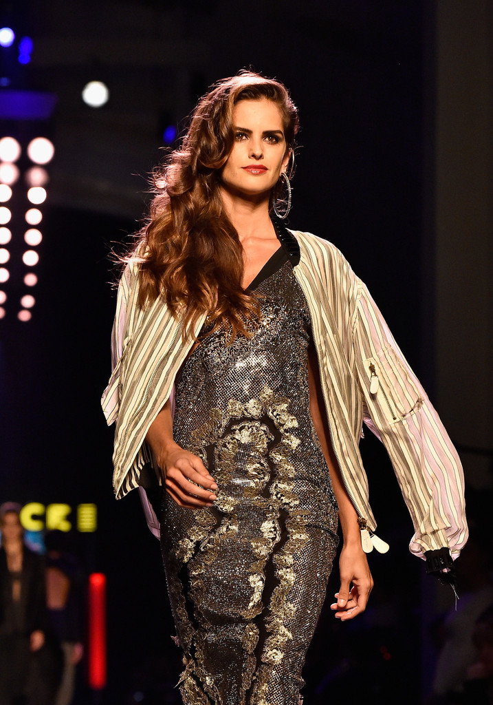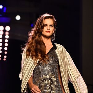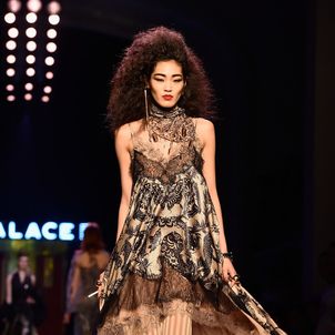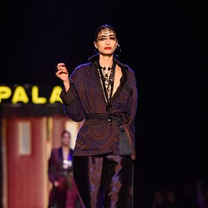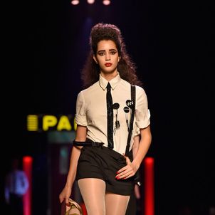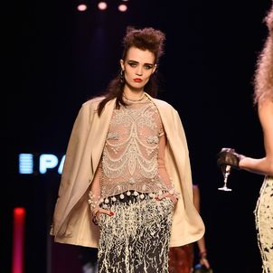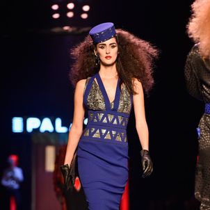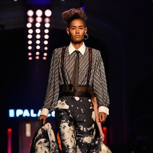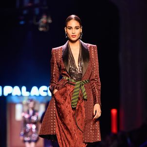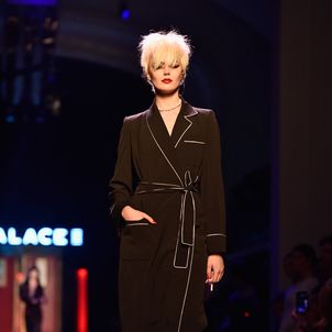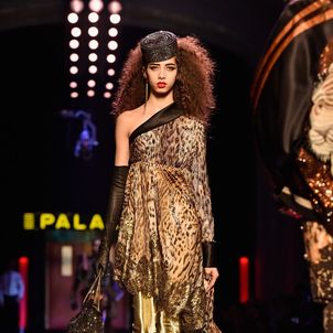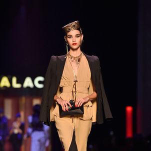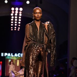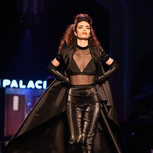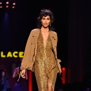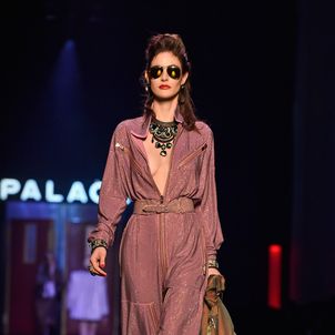 To this end the show was a riot of leather dungarees worn without tops, leopard-print kaftan dresses and trousers and blazers resembling bleached denim. Liberal use of metallics flashed to the surface via bronze bikini tops worn under silky bomber jackets and a pale gold blazer with padded shoulders and black piping, worn 1980s-style as a dress with fishnet tights. A sparkly mauve boiler suit was worn slashed to the waist and languid pyjama-style suits were littered with sequins for a debonair vibe.