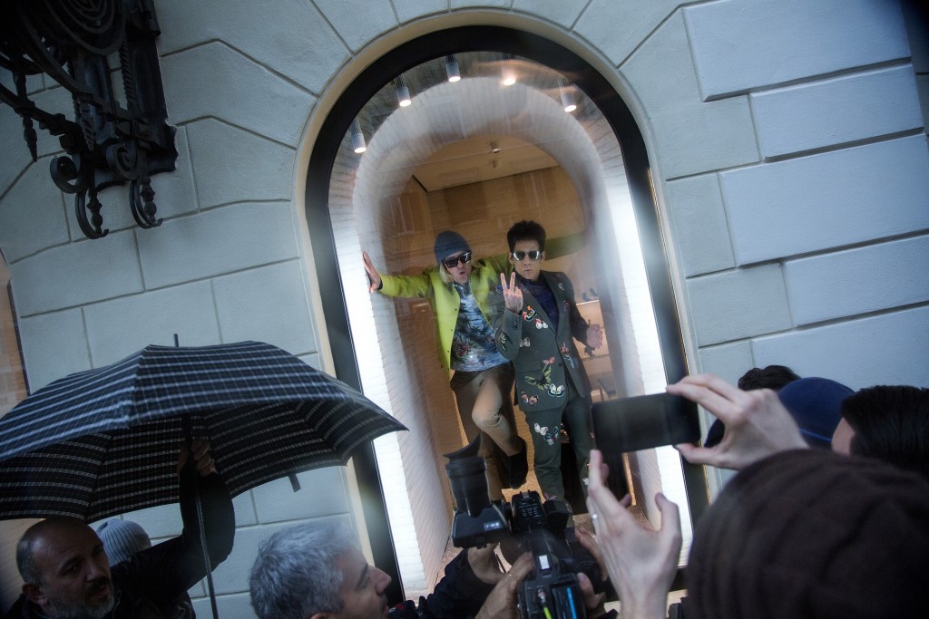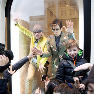 Ahead of the global premiere of Zoolander 2, the long-awaited sequel starring Ben Stiller and Owen Wilson that takes an exaggerated mockery of the modelling and fashion industry, the two actors made a brief appearance at Valentino's store windows In Italy to exhibit their 'modelling skills'.