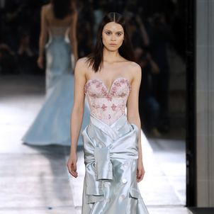 Then came the march of the princesses, with ball gowns each as spectacular and voluminous as the next. There was a striking dress with a full skirt of layered tulle plumetis worn over a pearl satin corset, and a big golden-toned strapless dress with bows at the pockets. This creation, in particular, grabbed the attention of guests and followers on the internet, who compared it to Belle’s ball gown in “Beauty and the Beast.”