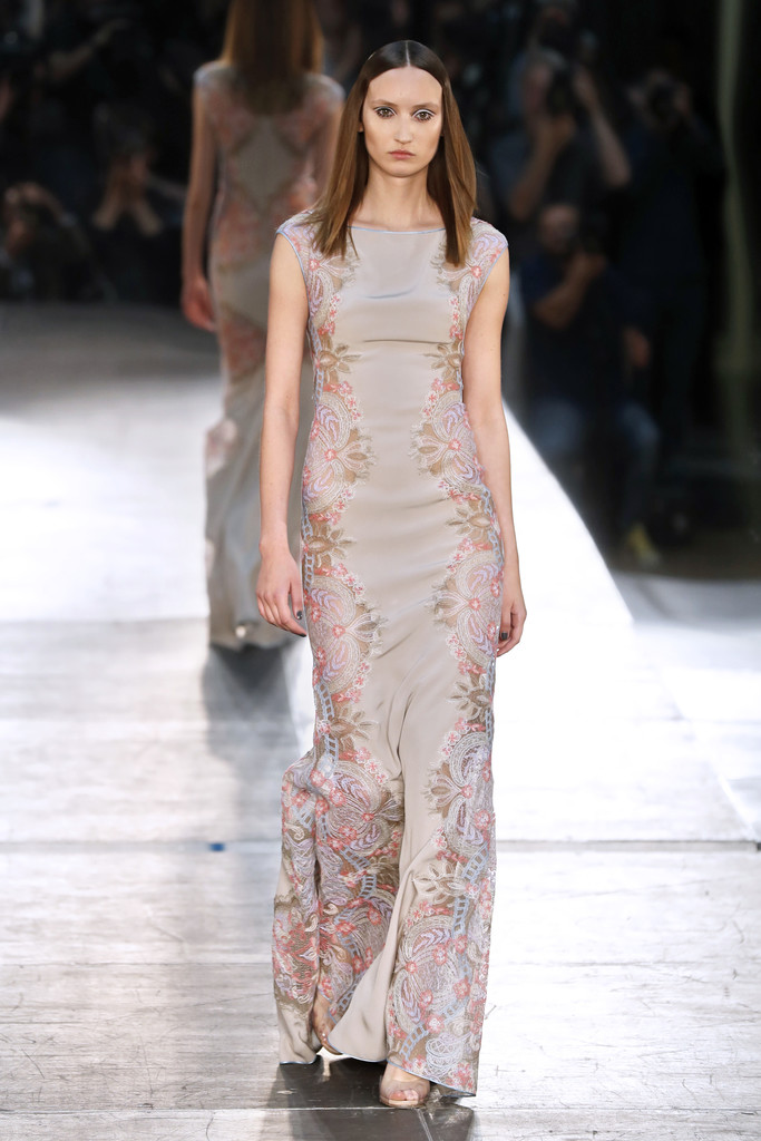 As the show opened, the first creations lengthened silhouettes, accentuating femininity with bare shoulders and emphasized waistlines and hips. Dresses came cut quite close to the body, generally taking the form of crêpe shift dresses, whether strapless, with plunging necklines or with tie-necks. These came matched with satin capes or satin ribbon ties, in pastel shades like aquamarine, sea green, lilac and blue.