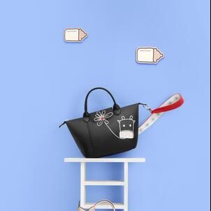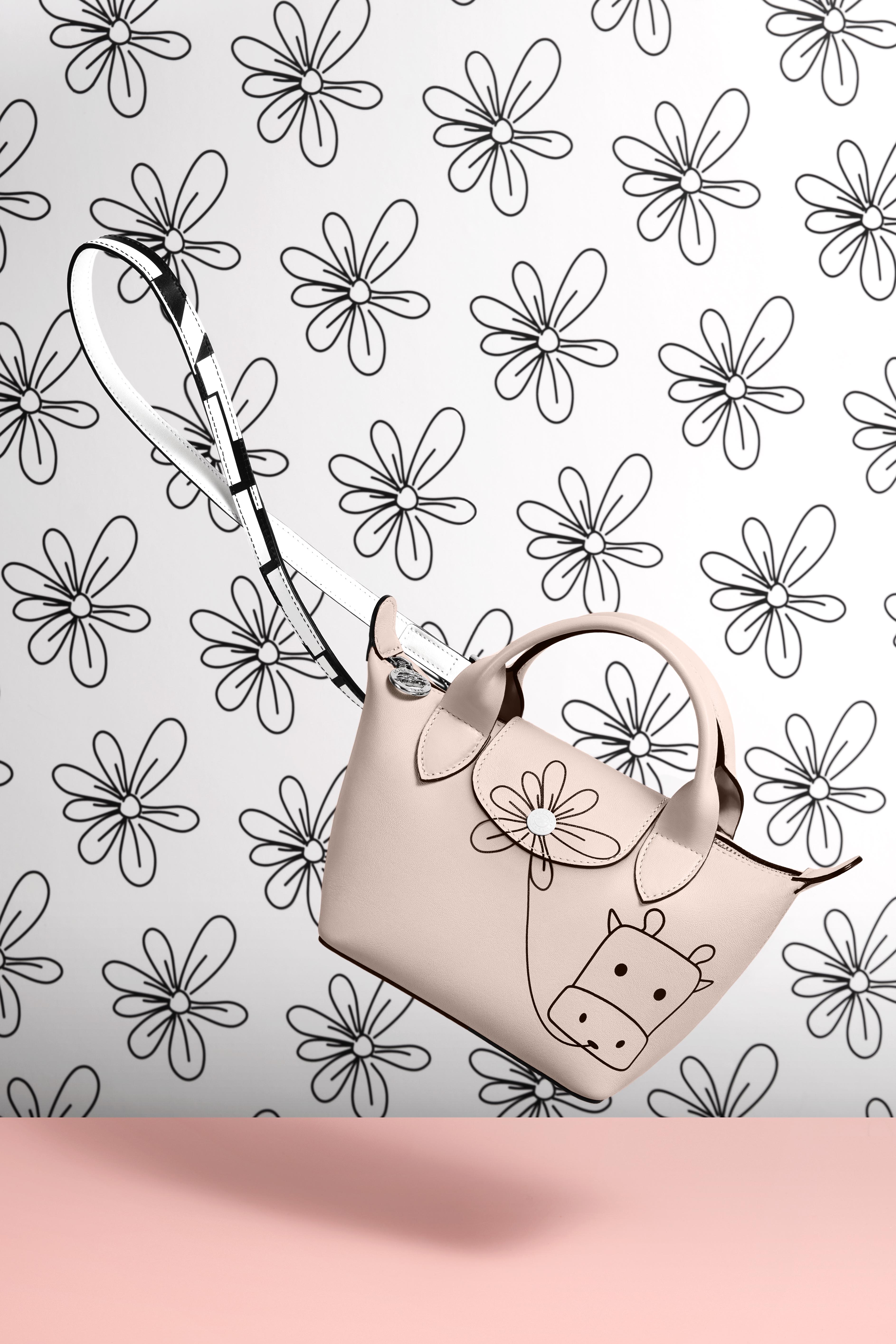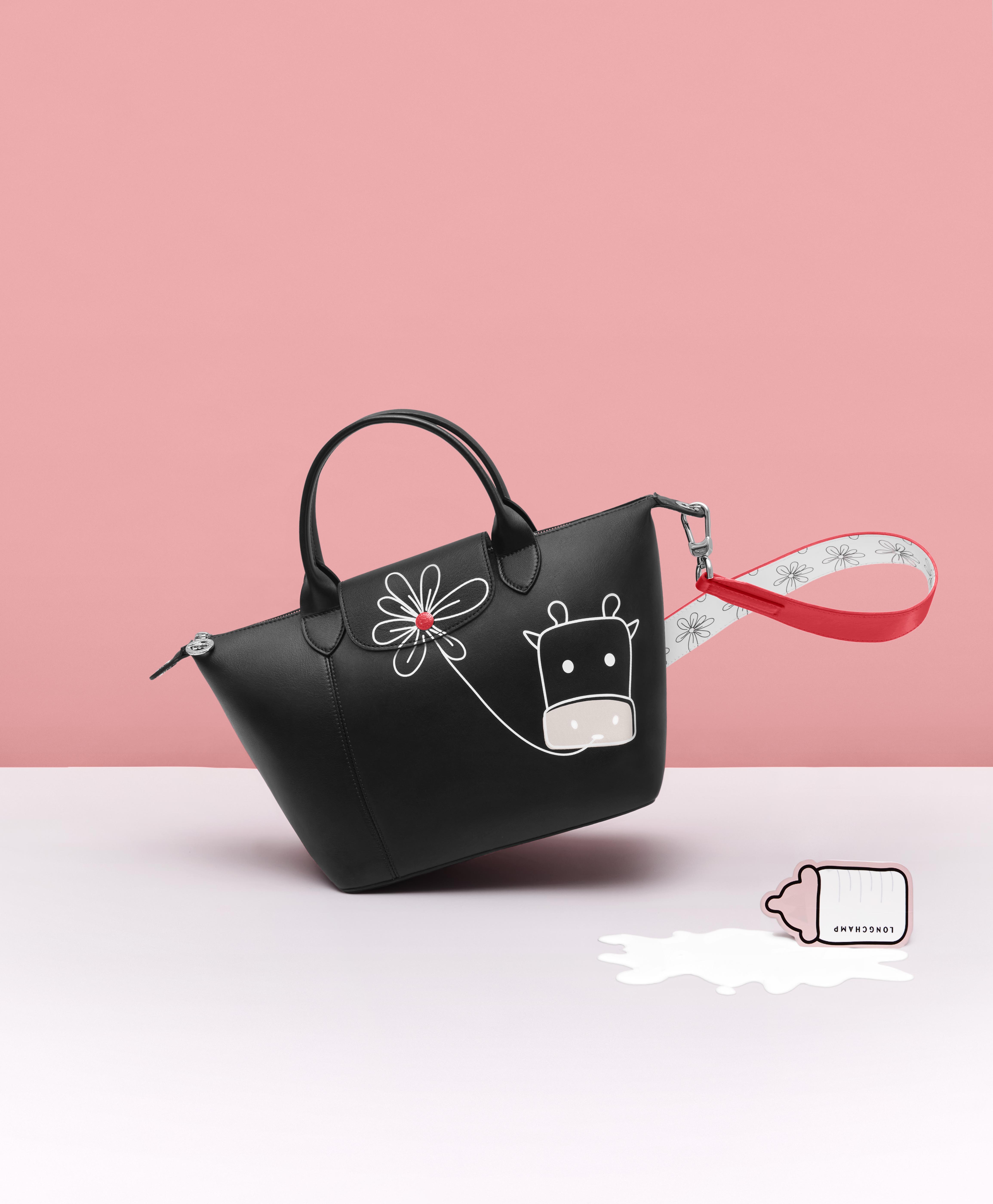 Silkscreen-printed in white onto the bag’s soft black métis leather is a cute interpretation of the ox: two big round eyes, two dainty little horns and a soft-pink snout. This charming creature is munching on a daisy stem, with the flower reaching all the way up to Le Pliage® Cuir’s signature flap, where a red snap fastener marks its centre.