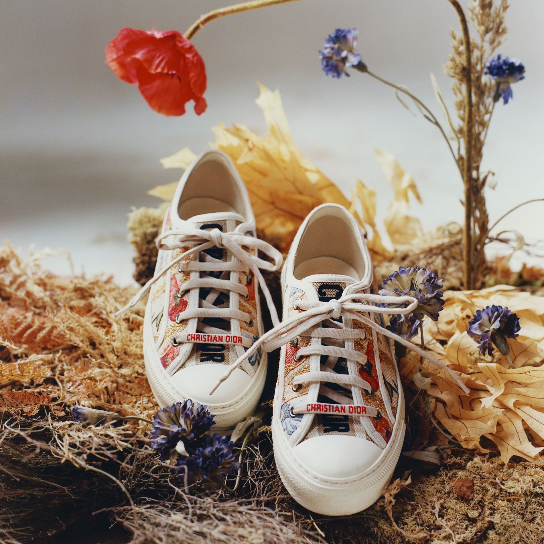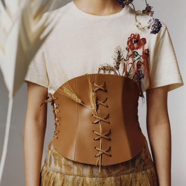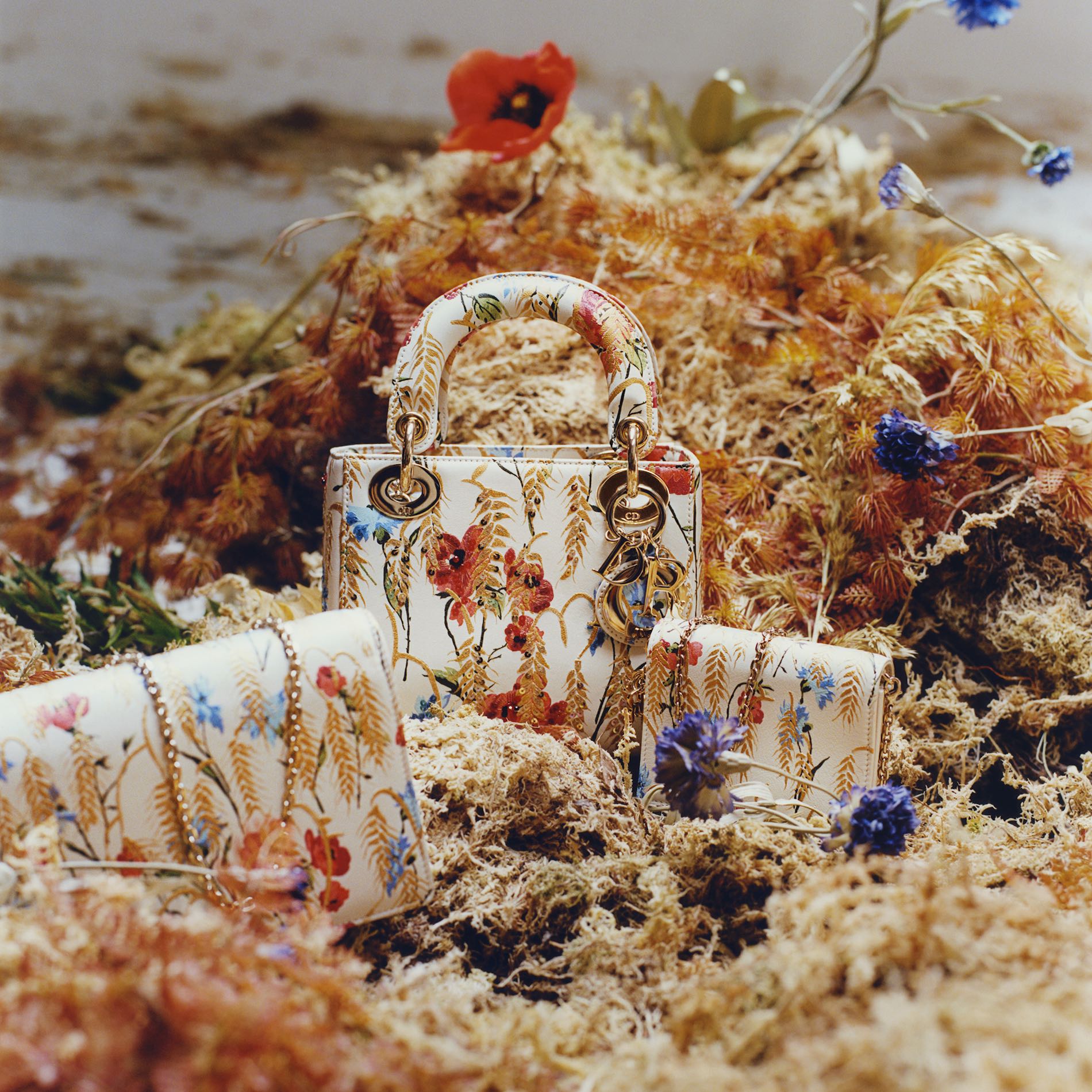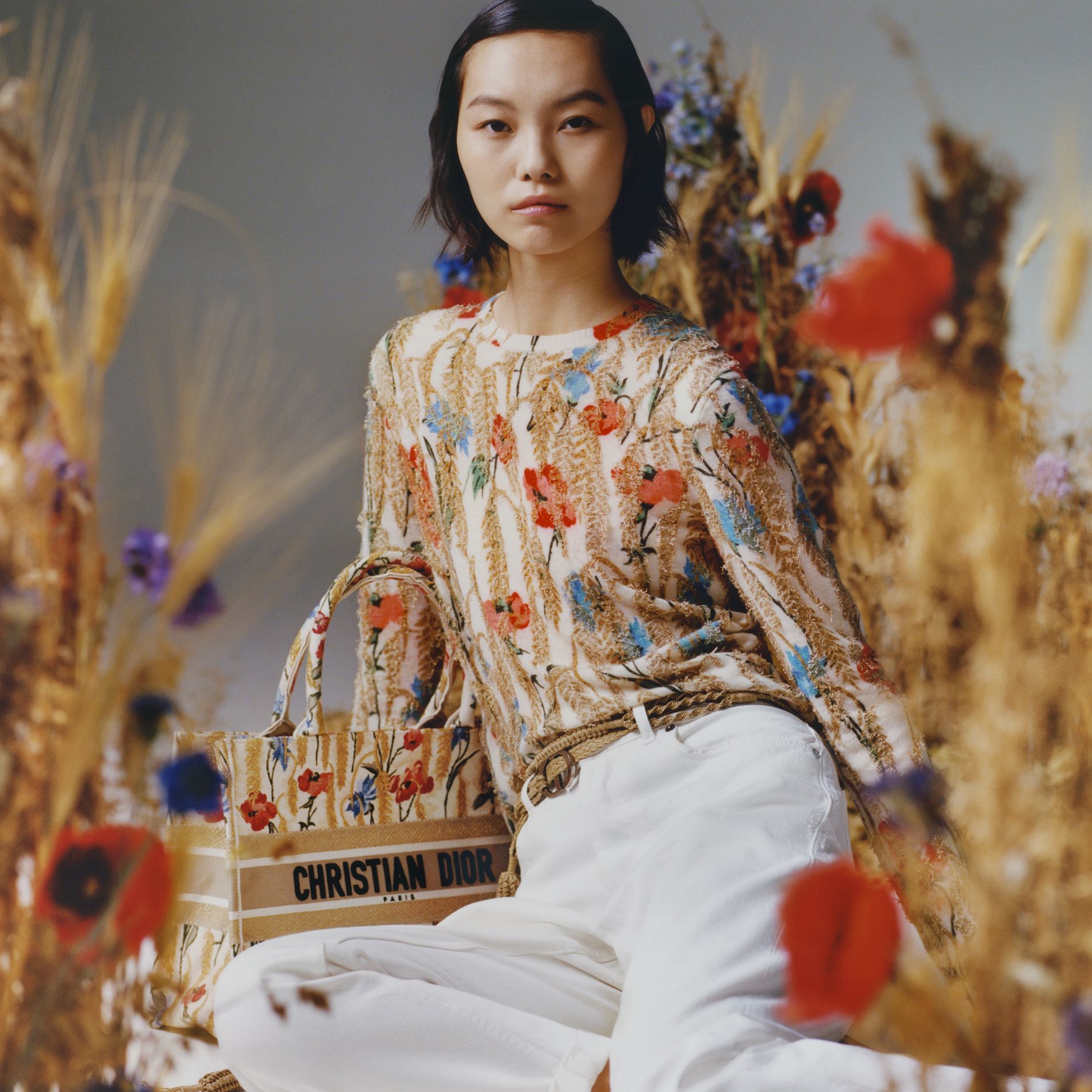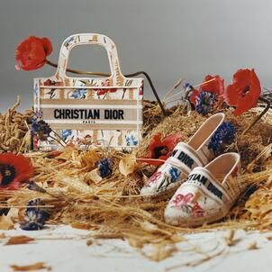 An elegant floral motif, baptized "Dior Hibiscus", embellishes a series of ready-to-wear pieces, bags, jewelry and accessories. These delicate floral designs inspired by the Hibiscus rosa-sinensis, or "China rose", are displayed alongside ears of wheat on lightly pleated dresses, airy skirts and flowing tops, also infusing the iconic Dior Book Tote and Lady Dior with a bucolic spirit.