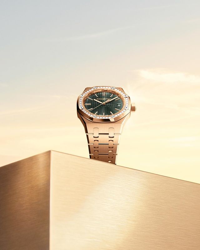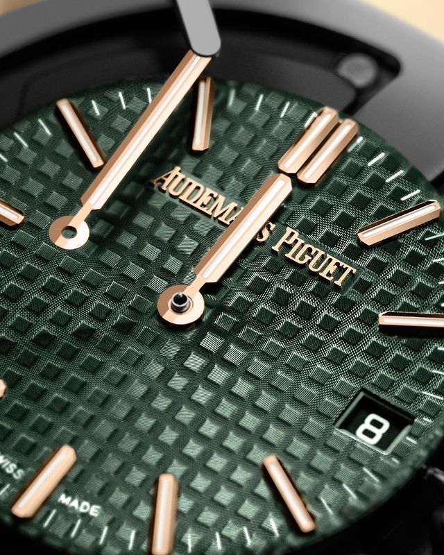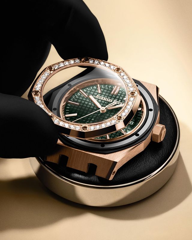 The 37 mm Royal Oak Selfwinding timepiece enriches the case, bracelet and dial design evolution seen across the 37 mm collection, with a diamond-set bezel and a new khaki green hue for its Grande Tapisserie dial.
