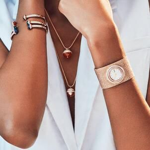 Available exclusively in Piaget Boutiques, this women’s cuff watch with a Milanese mesh bracelet perfectly encircles the wrist.