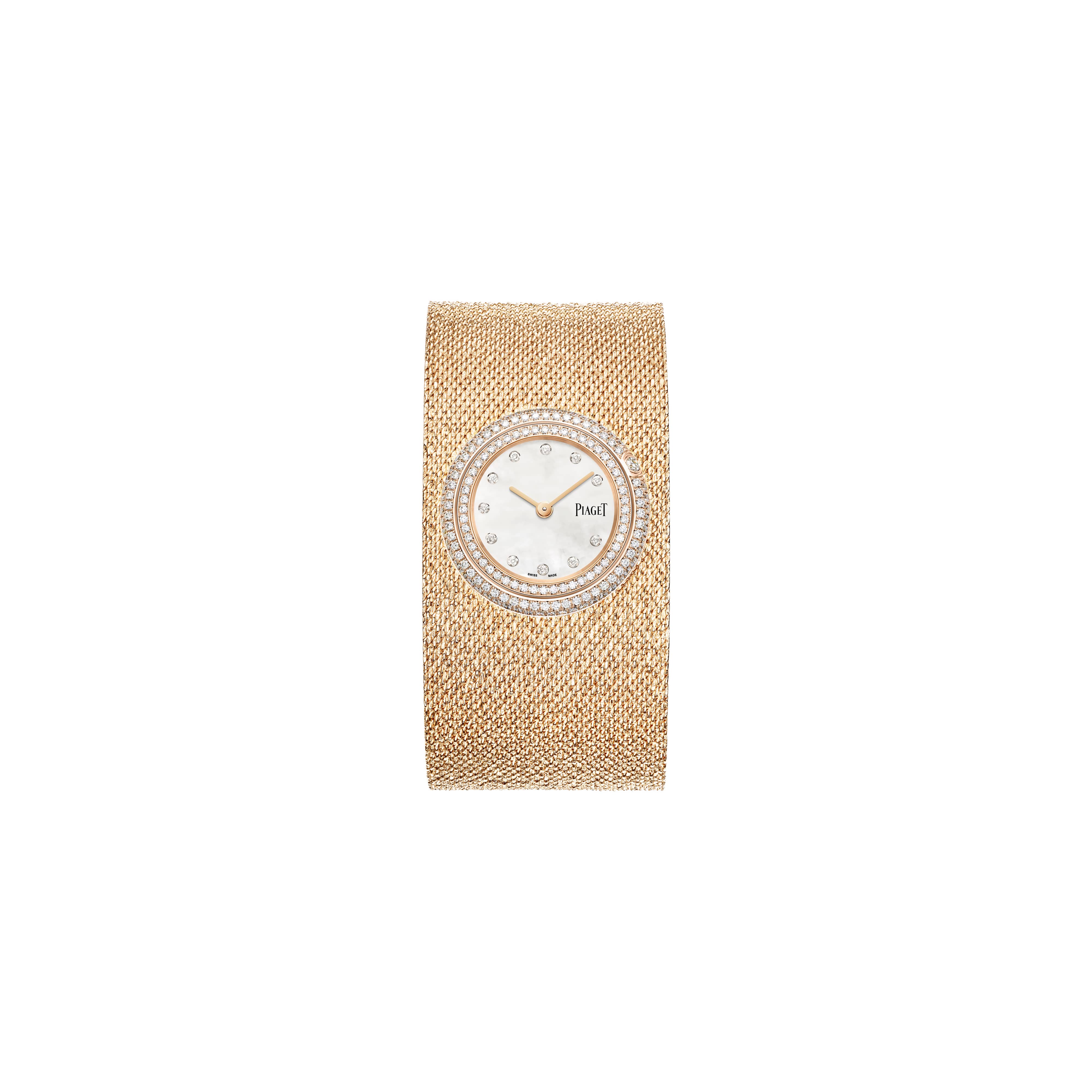 This luxury cuff watch is adorned with a sumptuous rose gold Milanese mesh bracelet, while its mother-of-pearl dial with round diamond indexes is illuminated by brilliant-cut diamonds set on the case and rotating bezel.