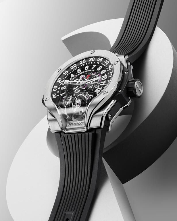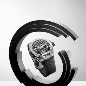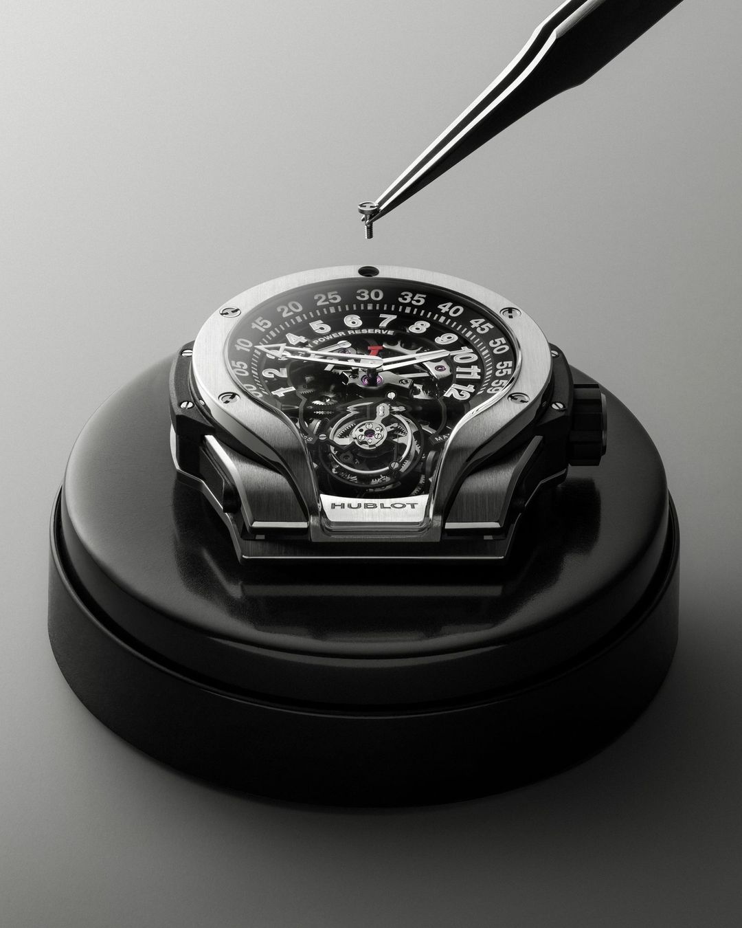 The 44 mm timepiece is encased entirely in brushed titanium and for the first time brings together two complications— the tourbillon and the retrograde display— in one, unique watch. the tourbillon features two axes—a considerable feat, as Hublot is one of only a few watchmakers capable of manufacturing a double-axis tourbillon entirely in-house, having first done so with the MP-09 in 2017. The tourbillon completes a full rotation every minute on one axis, and every 30 seconds on the other. Having two speeds within the same mechanism creates a view that is both hypnotic and technical.