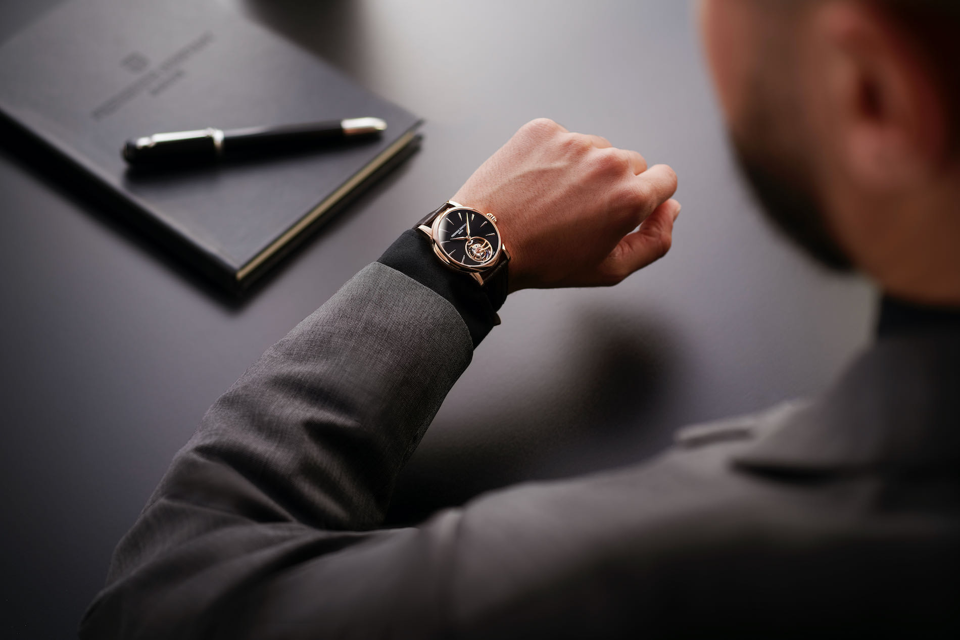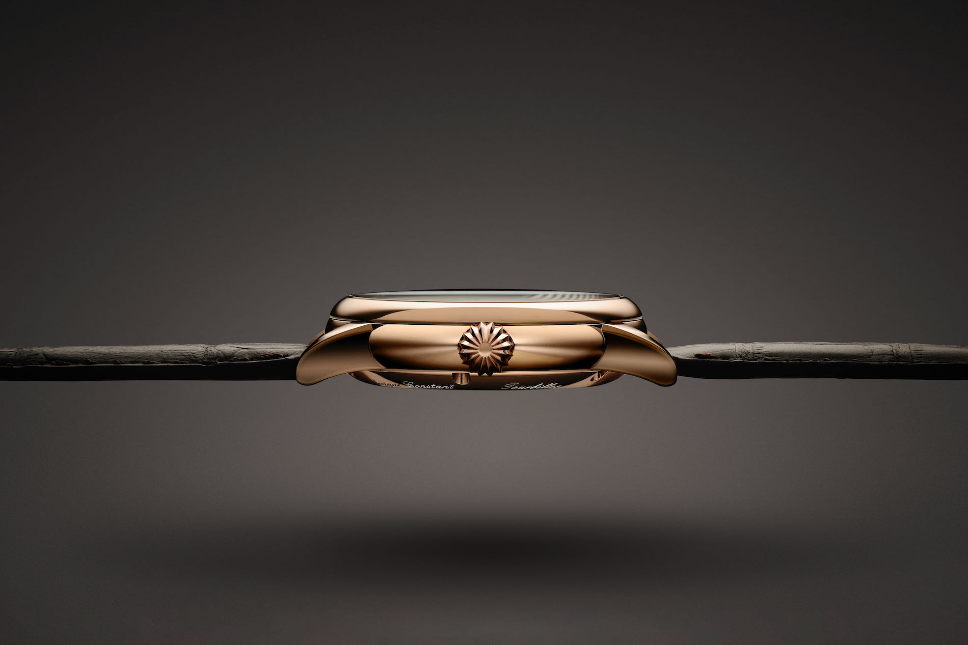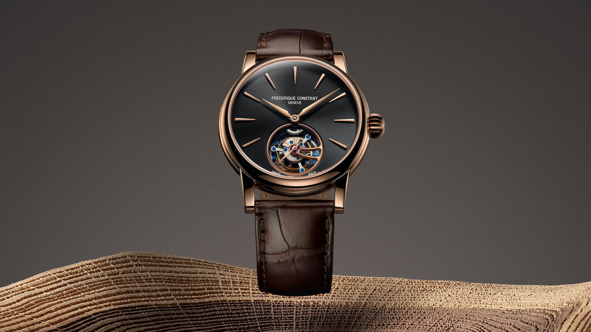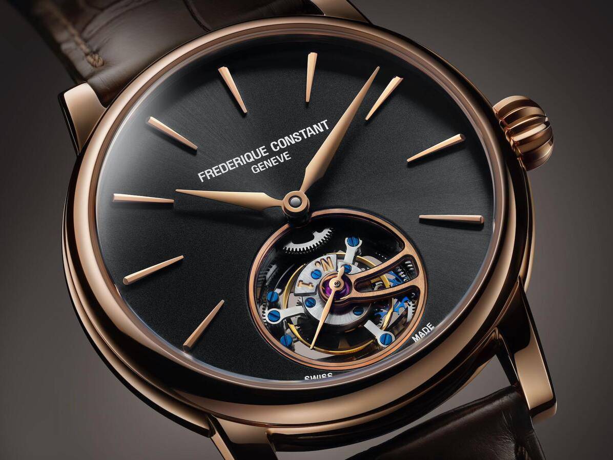 On the dial, purity is the watchword, with applique hour markers and hand-polished golden hands - redesigned to be narrower and longer - gliding over an anthracite grey sun-brushed dial. In addition, the hour markers and hands now feature diamond cut edges, ensuring the brightest gleam possible. A discreet hand passing above the tourbillon cage marks off the seconds. The cage itself – made of 81 components – is engraved with the individual serial number of the watch, also to be found on the rim of the sapphire caseback. This reveals the inner workings of the FC-980 Manufacture caliber, to which all the finishings of traditional watchmaking such as bevelling, beading, circular graining, straight-grained flanks and mirror polishing have been applied.
