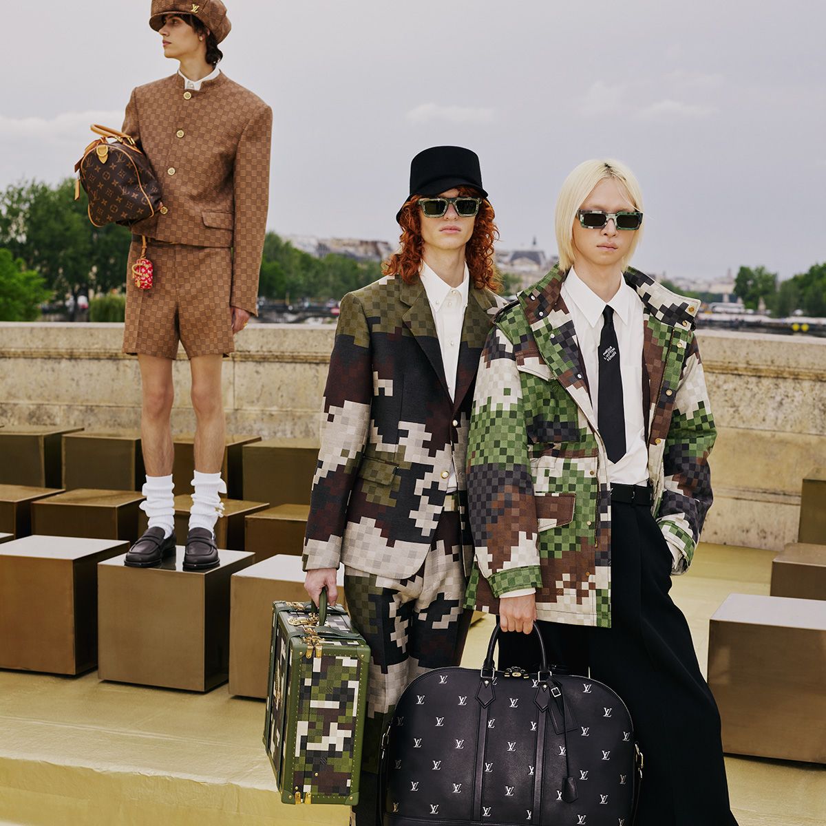 The show was presented on Pont Neuf, the oldest bridge in the French capital, in ever-present view of the adjacent Louis Vuitton studios. The Louis Vuitton initials become the emblem of a new culture of LVERS. Employed in graphics and embellishments, the marque represents a culture of a diverse global community connected by a like-minded appreciation for the core values of the Maison: the discernment, the savoir-faire, and the curation of its iconographic elements.