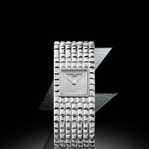 This return marks a sexy and glam-rock take on the definitive cuff watch. The design features a graceful bracelet embossed with a square Clou de Paris pattern that is elegantly echoed on the square dial.