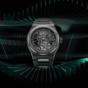 The attention to detail extends to the smallest elements, such as the small skeletonized seconds hand discreetly positioned at 10 o'clock and the sapphire caseback adorned with a metallized Aston Martin logo. This fusion of horology and automotive engineering is powered by a variable inertia balance that ensures precision and a power reserve of 54 hours. Available worldwide at Girard-Perregaux retailers, the Laureato Skeleton Aston Martin Edition is a refined fusion of two worlds that proves true style is instantly recognizable.