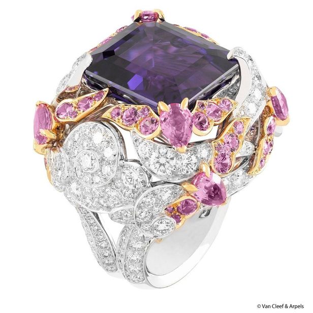 Van Cleef & Arpels has unveiled the Bianfu ring, from the new High Jewelry collection Palais de la chance, adorned by an extremely rare purple sapphire and bat motifs symbolising happiness and prosperity in Feng Shui.