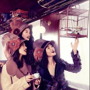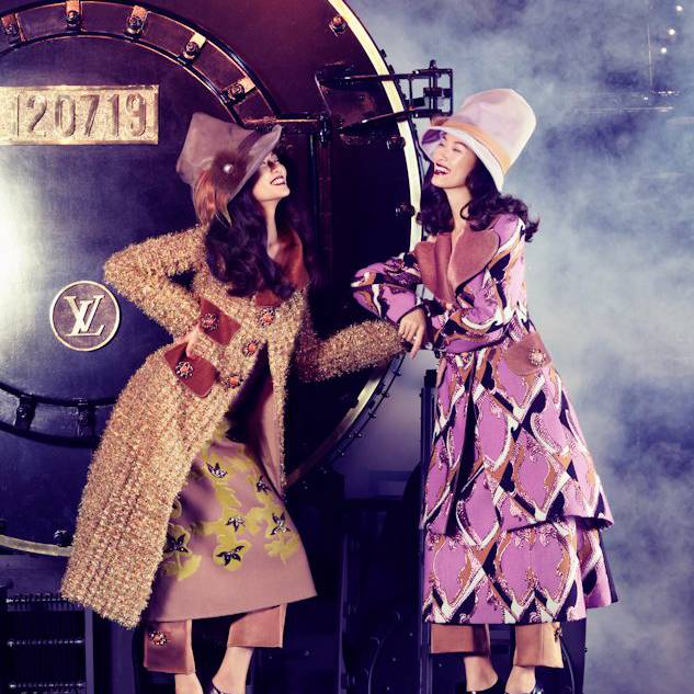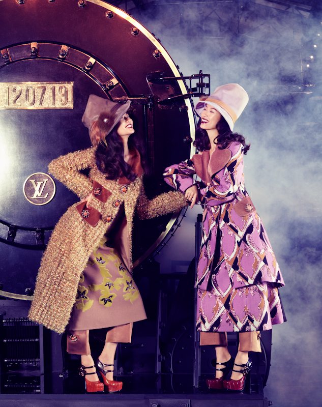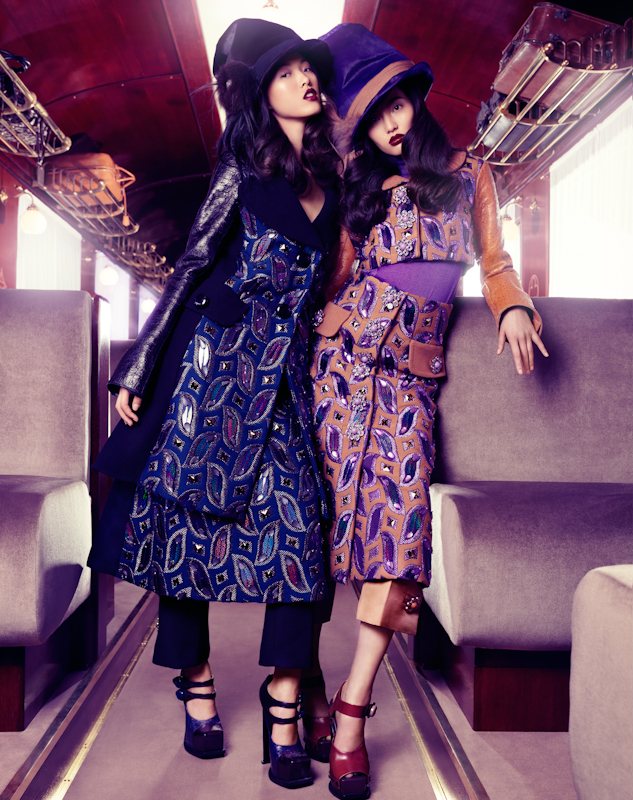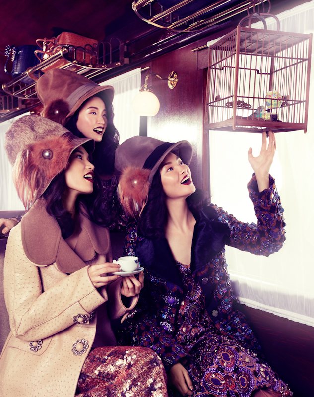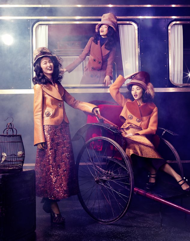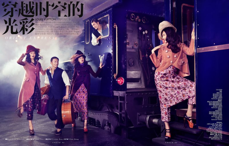 Shipped piece by piece from Paris to Shanghai for a special runway show, the Louis Vuitton Express gets spotlighted once again for this feature in Vogue China Collections’ fall-winter edition. In front of Stockton Johnson’s lens, models Tian Yi, Bonnie Chen, Miao Bin Si, Danni Li and Ma Jing live the in the lap of luxury in head-to-toe Louis Vuitton looks styled by Candy Lee. With creative direction by Alexander Chow, the girls wow in beauty looks courtesy of hair stylist Charlie Taylor and makeup artist Alan Milroy.