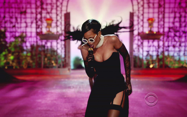 During the performance, Rihanna wore a long formfitting black dress with a slit up the side, a pearl necklace, and pearl sunglasses. She strutted her stuff up and down the runway while singing "Diamonds". At the end of the 2012 Victoria's Secret Fashion Show Rihanna got the chance to perform another song, which was "Phresh Out the Runway".