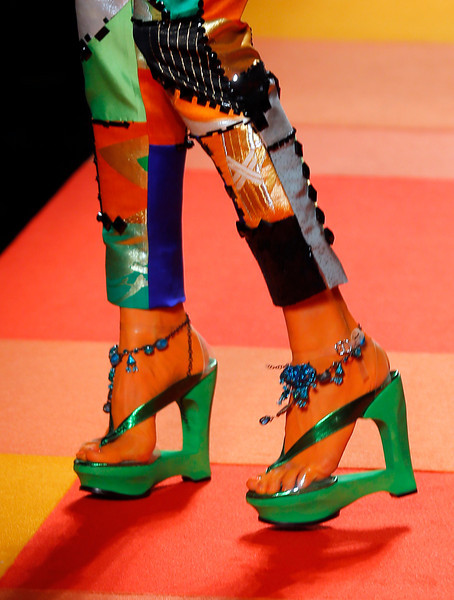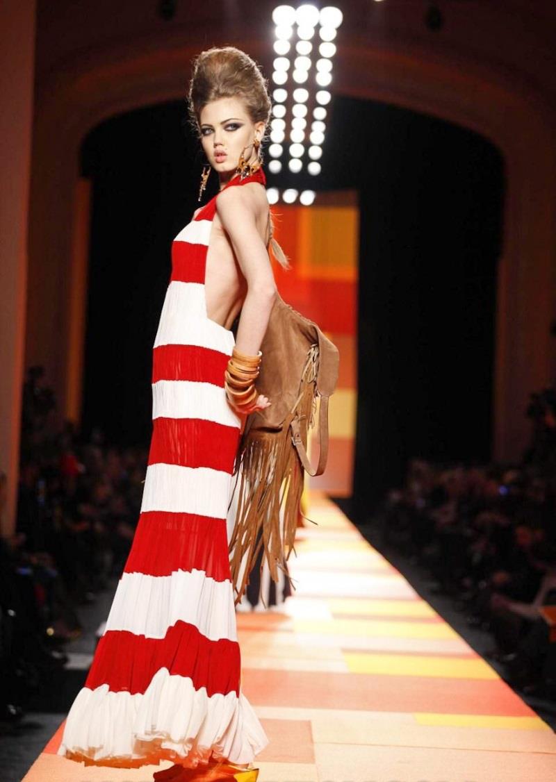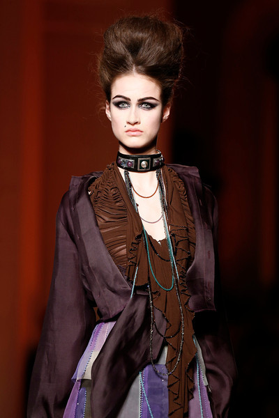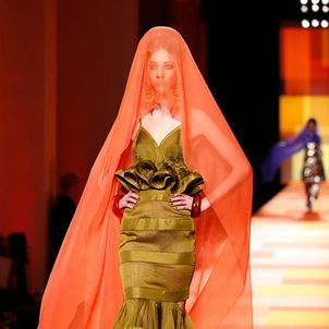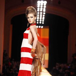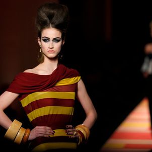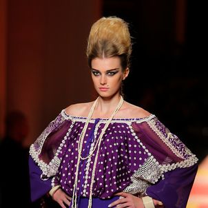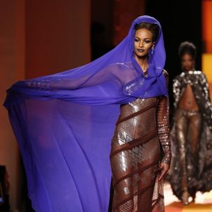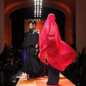 The designer's signatures were duly in place: a super-chic trench coat was cut in shimmering gold snakeskin, the Le Smoking was re-worked in ever more vampish incarnations and, of course, corseted underwear as outerwear made a suitably pneumatic an appearance too. A collection that started out monochrome, though, soon exploded into vivid colour: saffron and iris, chartreuse and flame. Pink being the navy blue of India, meanwhile, decreed that shade was there too, most sensational in the form of a fluttering fuchsia chiffon veil. Then there were tailored dhoti pants with ankle bracelets worn over their cuffed hems, fringing on everything from jewelled jackets to purses and skirts worn over trousers, another Gaultier hallmark, but in this instance particularly apt.
