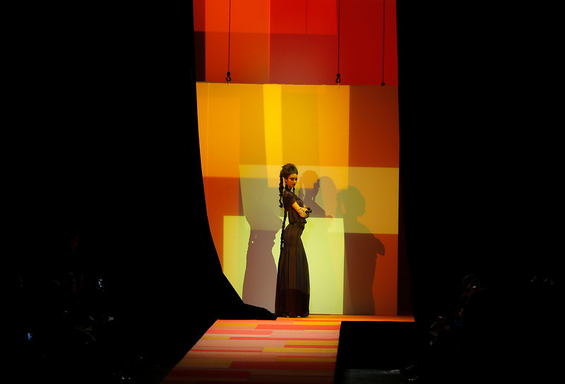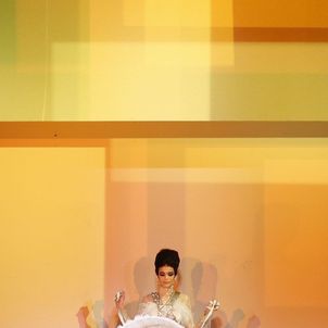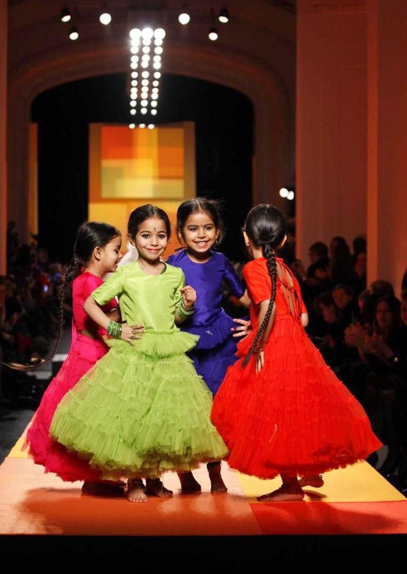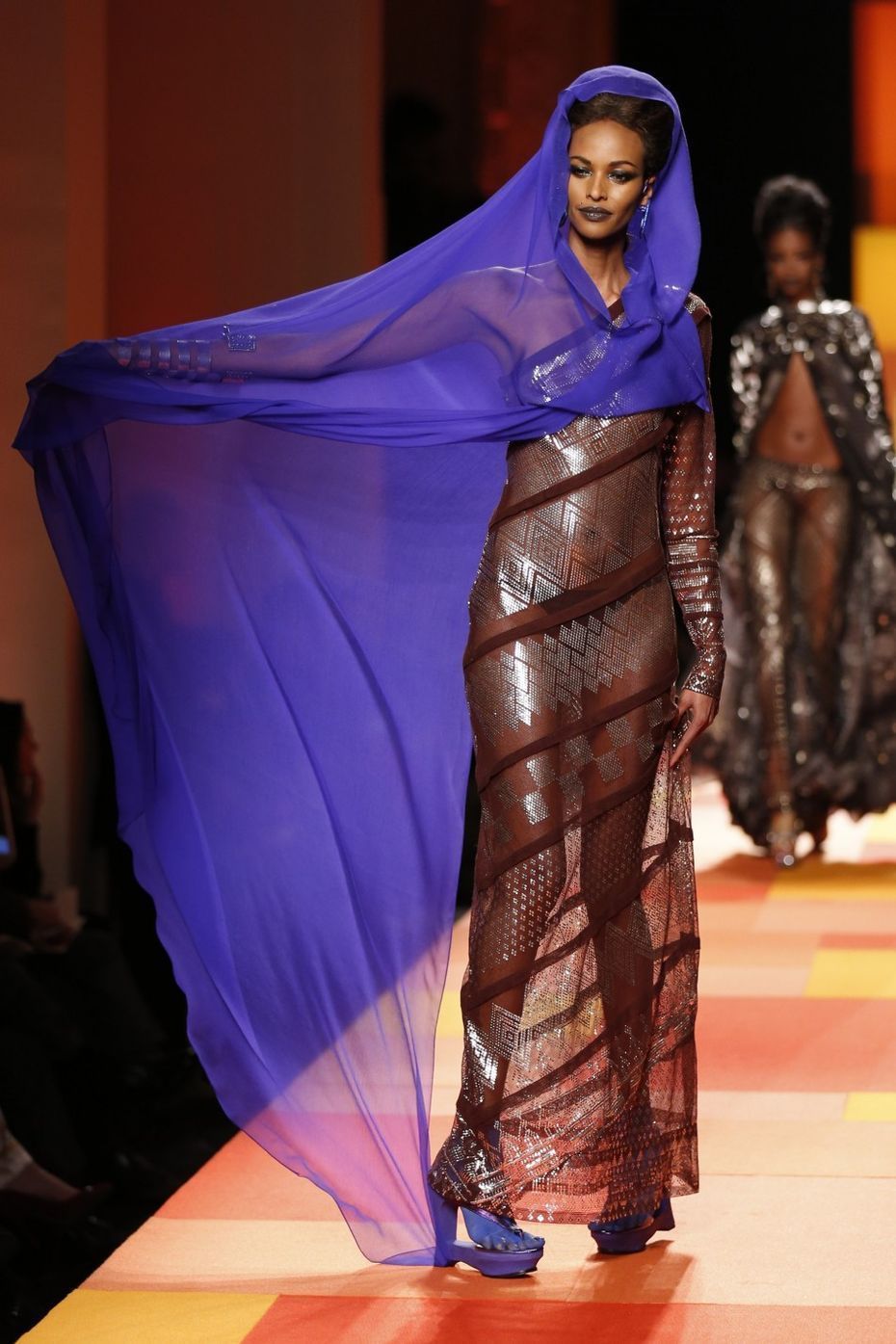 With the catwalk patch-worked orange, yellow and red, the show space at Gaultier's grand Rue Saint Martin headquarters bathed in amber light and guests seated in sections named after famous Indian dishes from 'vindaloo' to 'dal' it was clear that inspiration would be coming from that country. Gaultier is a quintessentially Parisian couturier, however, and so this saw two very different worlds collide - and all with his trademark maverick touch.