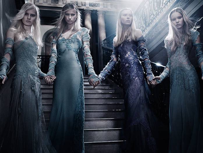 The February issue of Interview Russia showcases the spring 2013 collection from Alberta Ferretti with these ethereal images. Models Steffi and Daria (NY Models), Lauren (DNA) and Ella (Ford) pose for Christian Ferretti wearing the label’s stunning gowns styled by fashion editor Gro Curtis. The magazine was inspired by “The Virgin Suicides” and photographed the shoot in an old New York mansion.