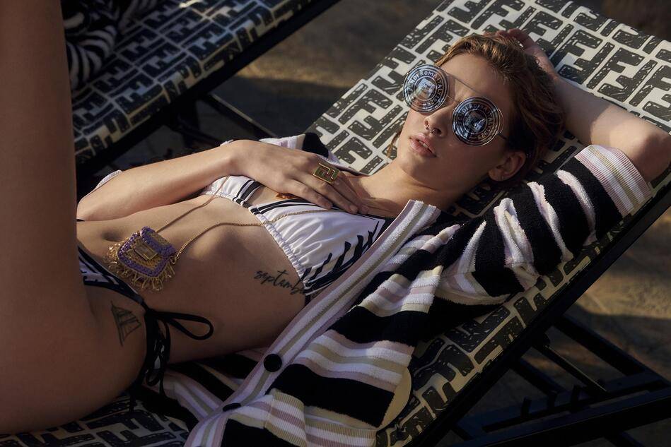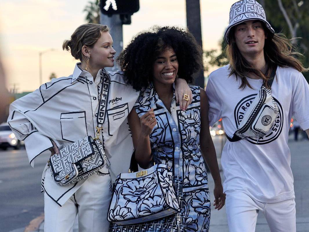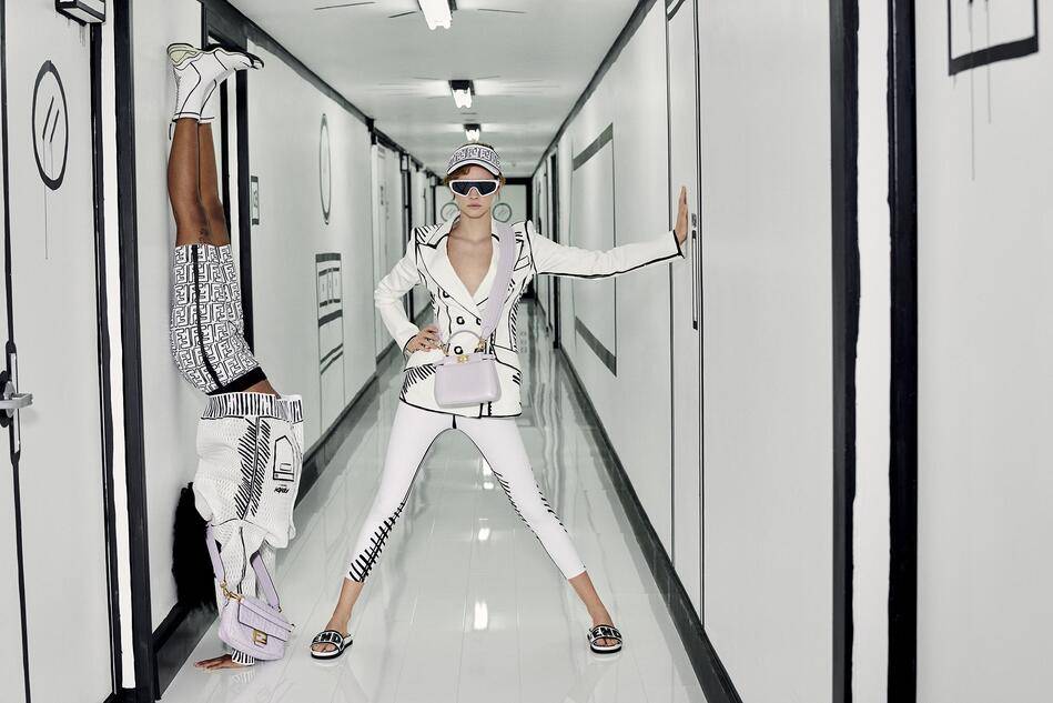 For the men, tromp l'oeil effects, shaded details, flowers and revisited FF logo patterns give a twist to cotton jackets, satin blousons, embossed leather outerwear, sweatshirts, T-shirts, denim pants, cotton trousers, Bermuda pants, as well as accessories, including the iconic Baguette, a small travel case, a backpack, a fanny pack, small leather goods, sneakers, sandals and slides.