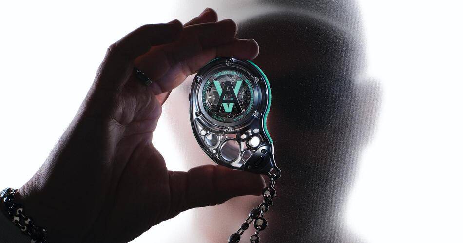 Its organic design is complemented by a titanium case and rubber bumpers, reflecting a bold departure from traditional watchmaking norms. Presented with two titanium chains, each featuring Hublot’s patented double "one-click" system for seamless attachment, the timepiece can be worn in multiple ways from a necklace to a pocket watch, or displayed as a sculptural centerpiece on its decorative titanium and mineral glass table stand.