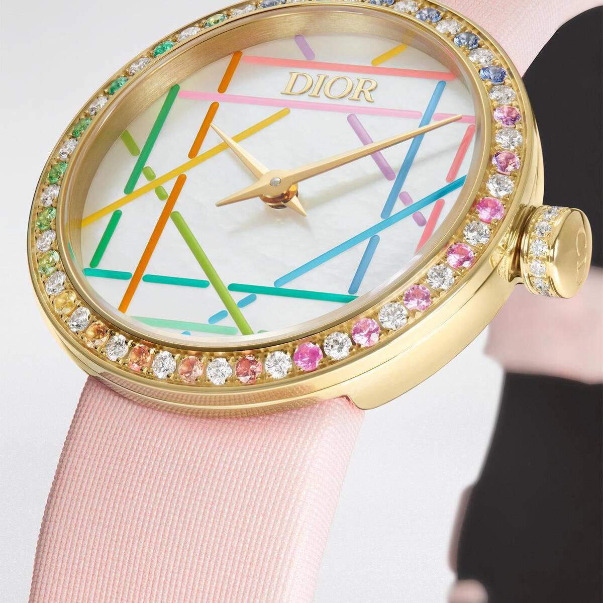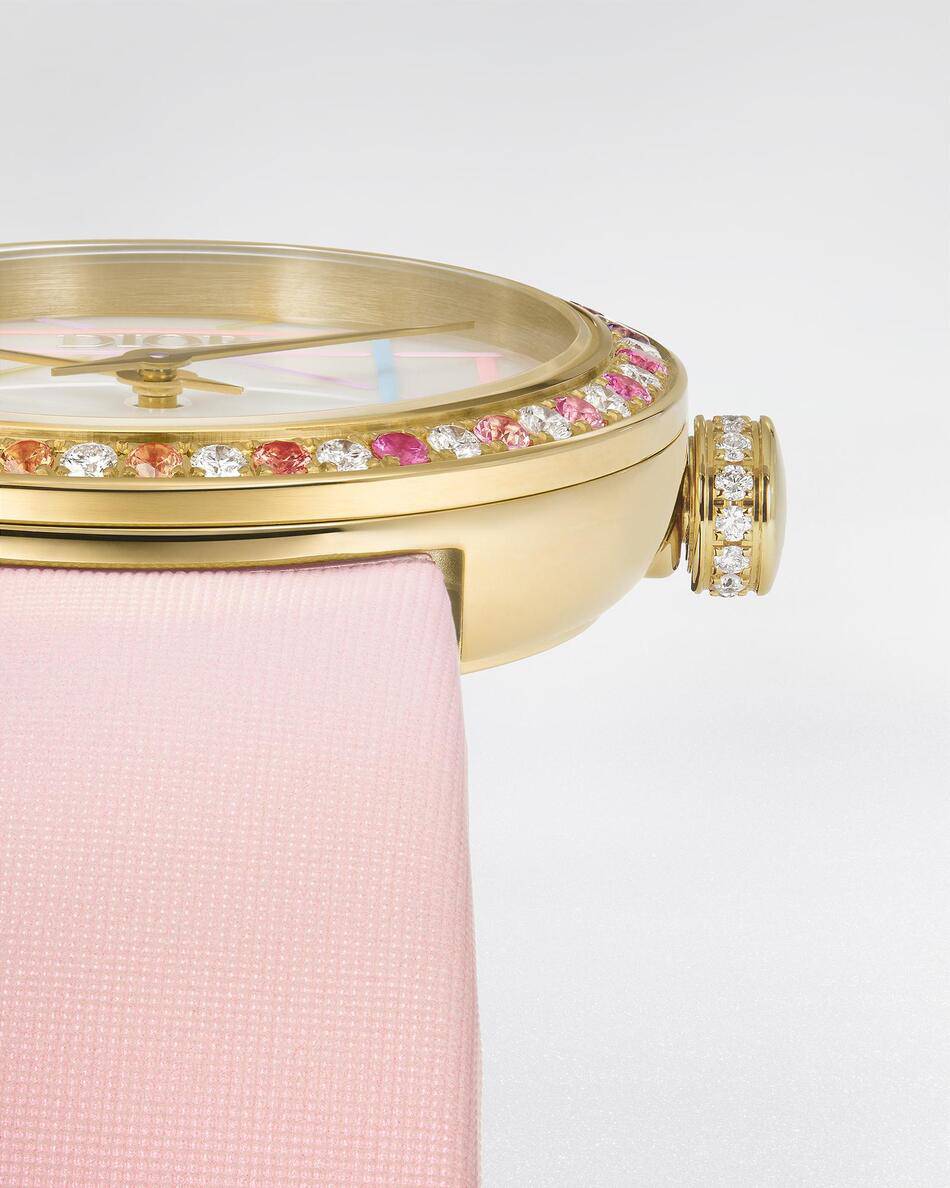 Every detail of the watch reflects a commitment to craftsmanship and color. Paired with a delicate pink satin strap and embellished with precious stones, the timepiece stands as a signature piece of the collection. It is a design that successfully captures a rich history while embracing a contemporary spirit.