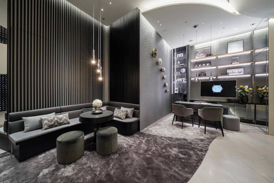 The visual identity of the manufacture unfolds in stately black and grey tones that are offset by soft white walls and textured finishes alongside plush furnishings. In the welcome area, a digital History Wall enhances the introduction to the rich heritage of the brand. Vitrines showcasing models of all watch families sit alongside curated historic pocket watches to emphasize the supreme craftsmanship on display.
