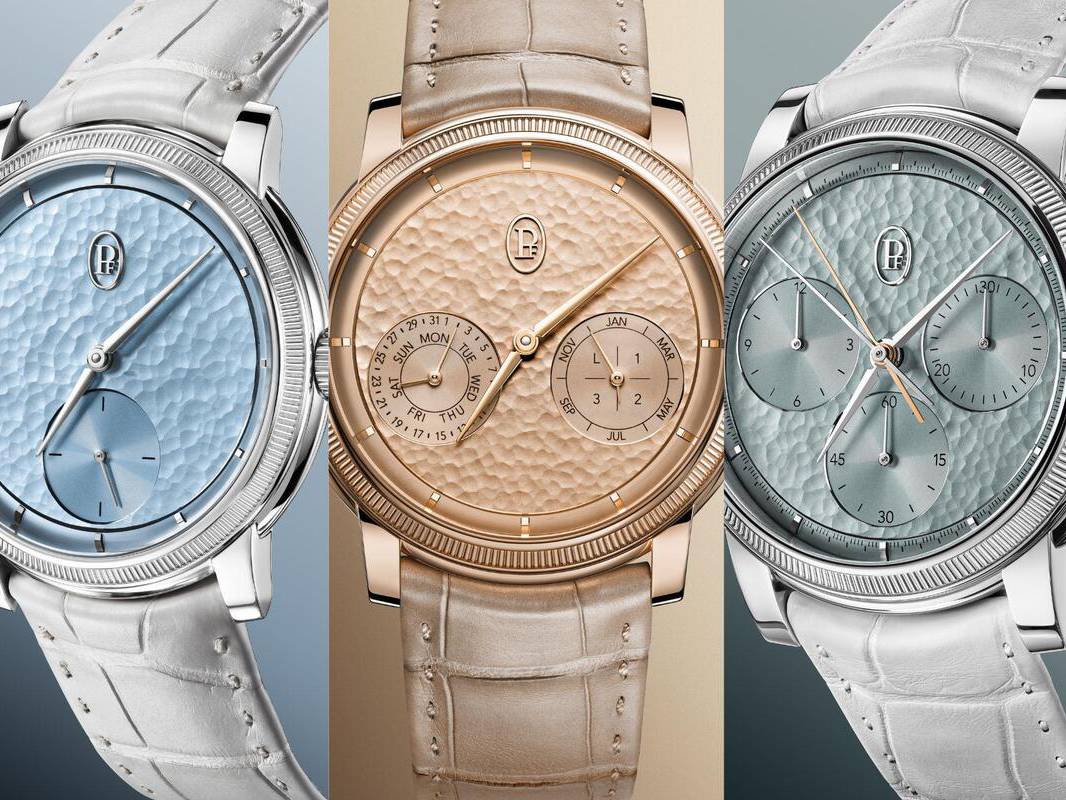 Creating a Parmigiani hammered dial is a demanding process spanning around sixty individual operations. To provide contrast, the counters are finished through a delicate azuré process where fine grooves are cut using diamond tools to capture light with precision.