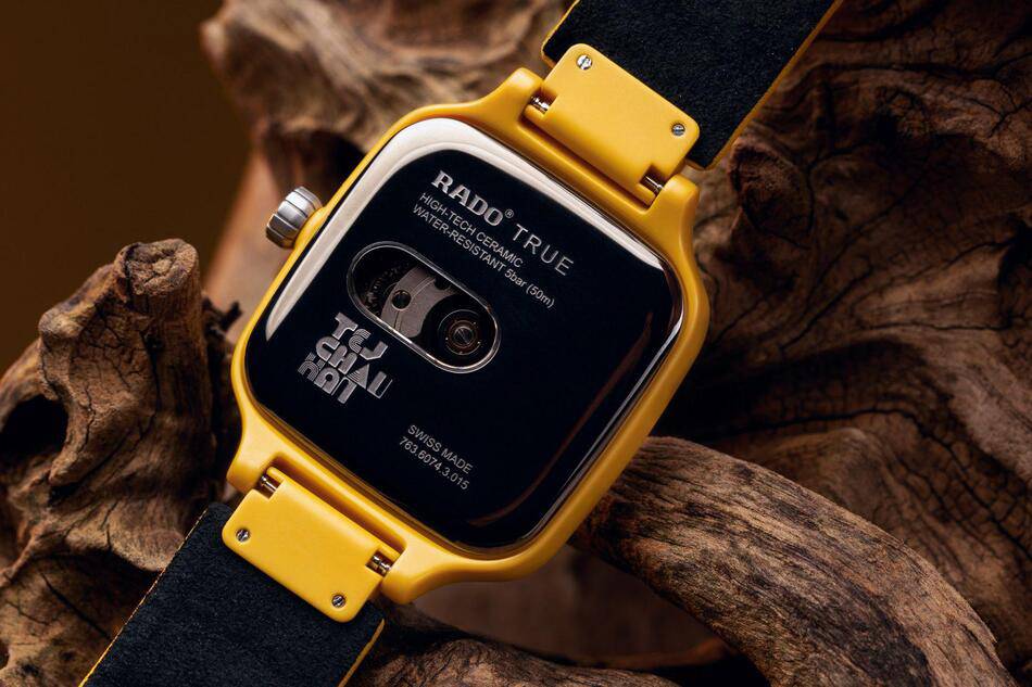 Working on the platform that is the Rado True Square, the new iterative piece has been given an eye-catching case made from matt yellow high-tech ceramic and enhanced by a colour-matched strap fashioned from cushion-shaped elements in yellow leather and connectors made from high tech ceramic.