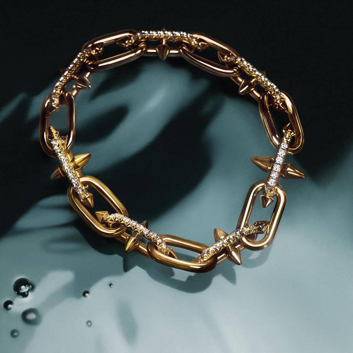 Adopting the structure of the trident, the Tiffany Titan by Pharrell Williams collection incorporates sharp, spear-like spikes within an array of necklaces, earrings, bracelets and rings embodying a sense of punk spirit.