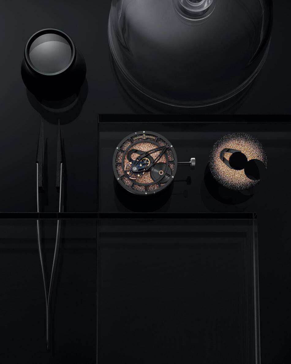 The centerpiece of this horological marvel is an innovative rotating hour disc crafted from Crystalium. This revolutionary material fuses scientific precision with raw aesthetic expression and begins with ruthenium, a platinum-group metal known for its strength that is ten times rarer than platinum itself. The metal undergoes a slow and controlled vapour-deposition crystallization process over several days which mimics the delicate way frost forms on glass. The result is a surface covered in natural and fractal-like crystal structures that are impossible to duplicate and full of shimmering texture. Each disc becomes a singular piece of material art that is further treated with a warm rose gold PVD finish and subtle black shading to deepen the contrast.