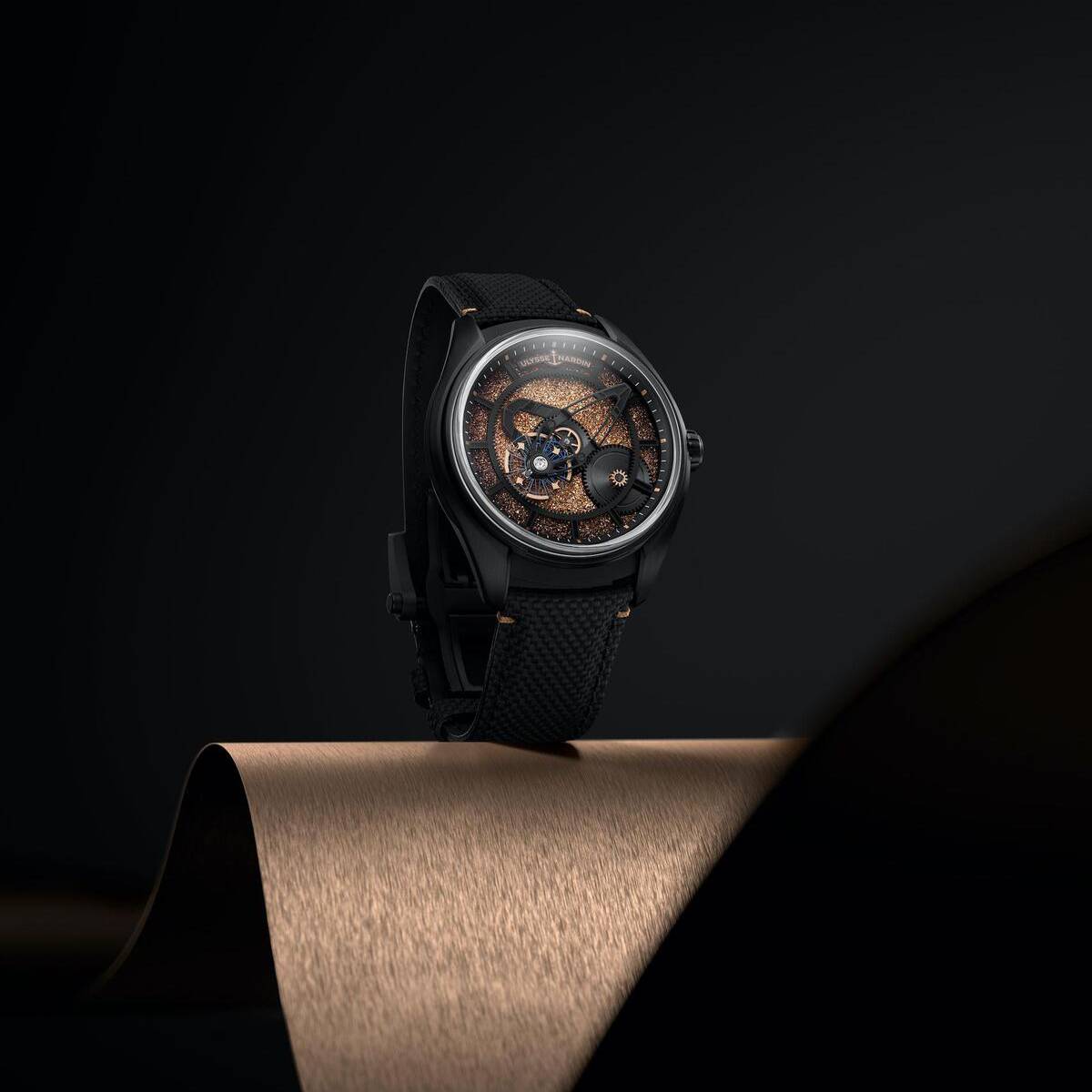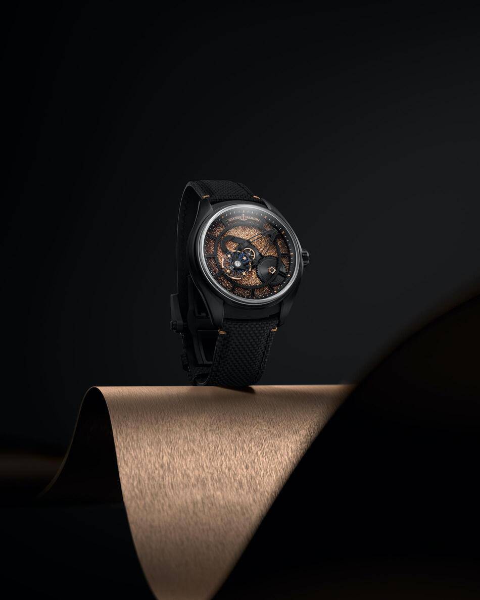 This captivating expression of material in motion is housed in a sleek black DLC-coated titanium case that creates a dramatic stage for the dial. The ultra-dark backdrop extends to the matching bezel and the ballistic-textured black rubber strap which gives the watch a bold and modern presence on the wrist. Against this shadow, the Crystalium disc radiates with a rose gold glow that feels alive with light and microscopic complexity. At the heart of the design lies the automatic calibre UN-230 which features a flying carrousel with a silicon balance wheel and escapement crafted entirely in-house.