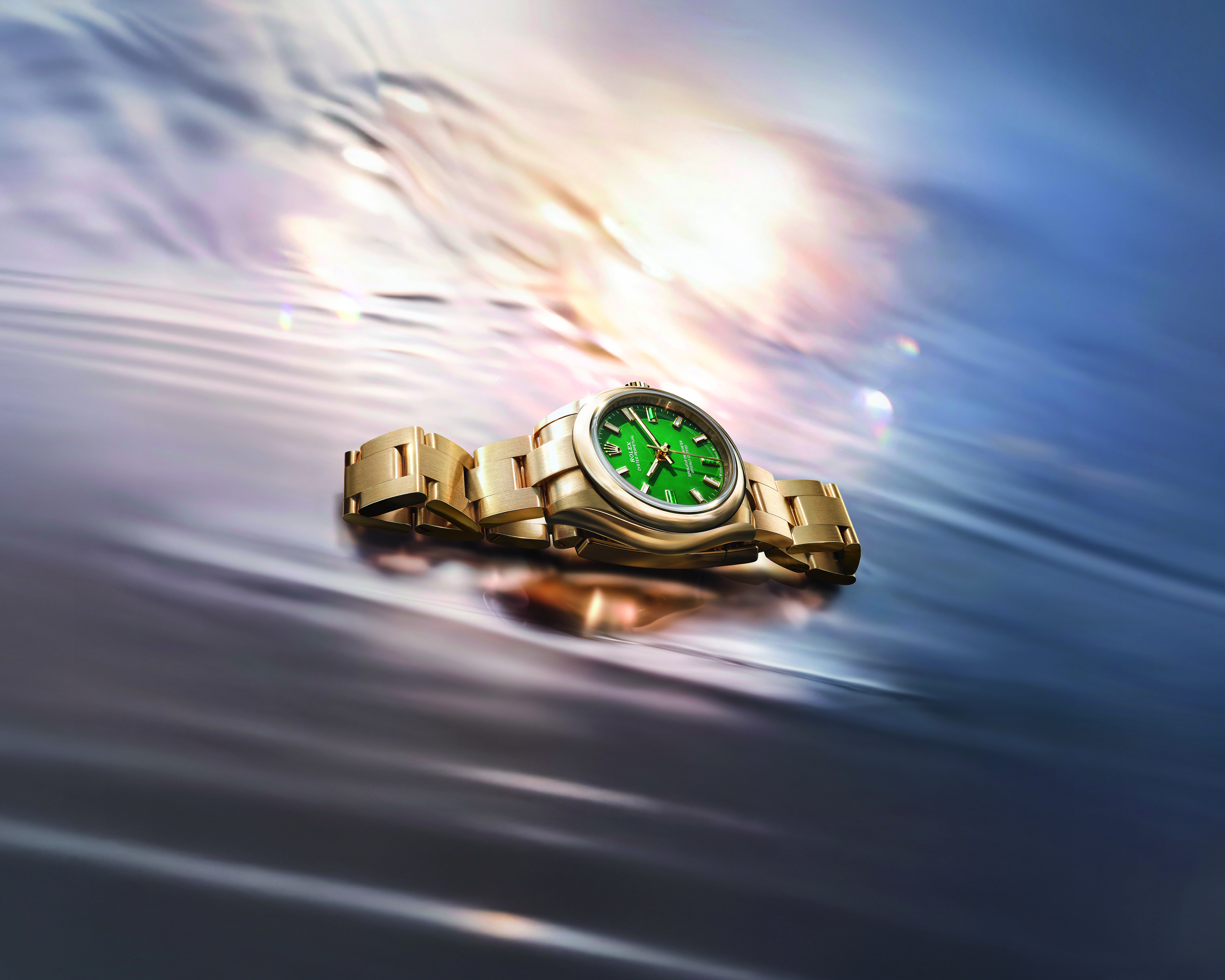 Creativity meets tradition in the choice of materials for these new iterations. The Oyster Perpetual 28 is fashioned from 18 ct yellow gold and features a vibrant green stone lacquer dial.