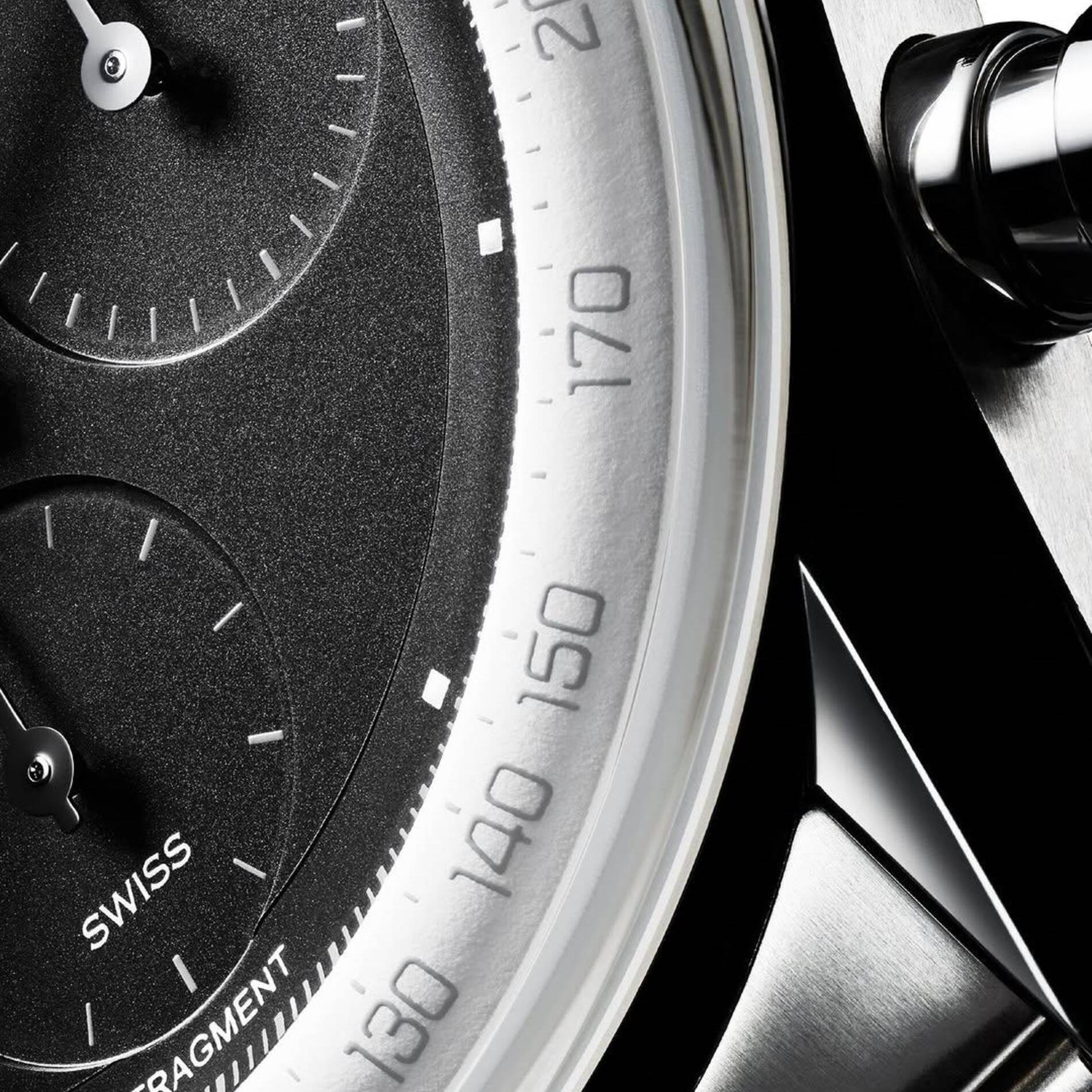 Fujiwara’s influence is woven into the details, with a subtle grey tachymeter, the Fragment logo printed directly on the crystal, and the brand's lightning bolt symbol replacing the "1" and "11" on the date disc. The watch is secured by a nostalgic "beads-of-rice" seven-row bracelet, modernized with black PVD central links and a fine-brushed steel butterfly clasp.