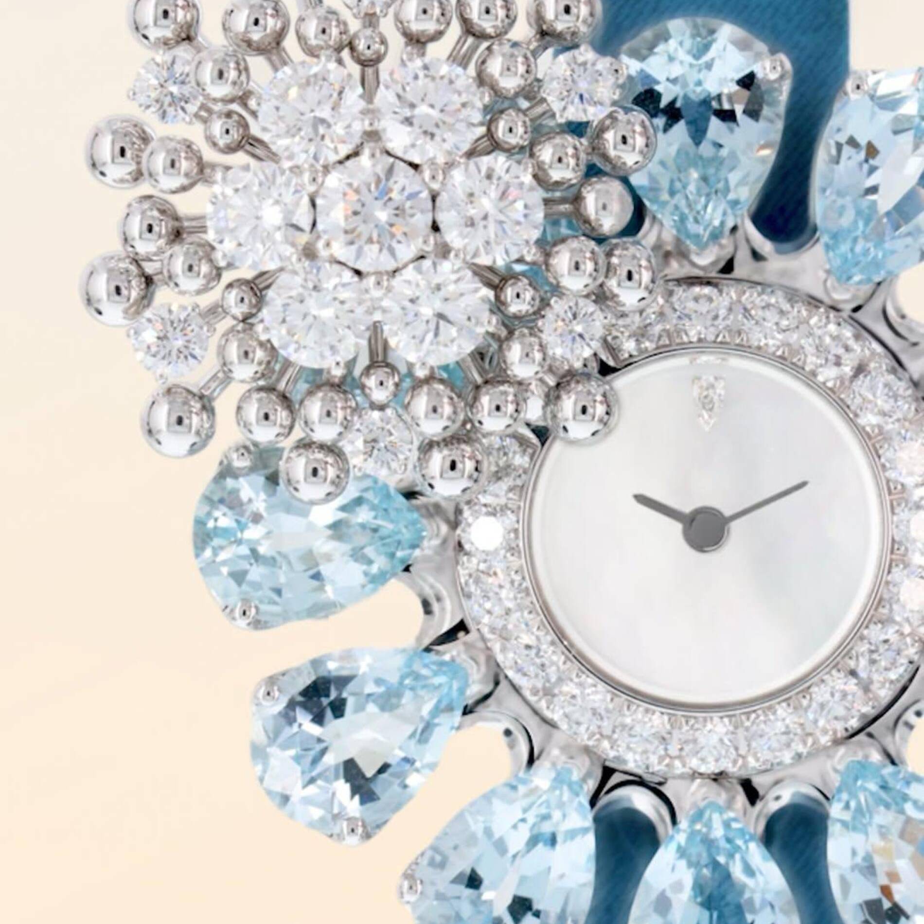 To discover the passage of time, one must simply rotate the rounded white gold and diamond pistils that sit at the heart of the flower. This playful movement unveils a hidden dial, allowing the wearer to savor the luminous hours of winter with a sense of quiet grace. The petals are crafted from serene aquamarine, a stone that imbues the flourishing silhouette with a feeling of weightless vitality and light.